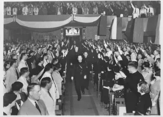 De derde NSB Landdag, gehouden op zaterdag 30 maart 1935 in het RAI gebouw te Amsterdam. Mussert spreekt tot de menigte. Bron: NIOD.
