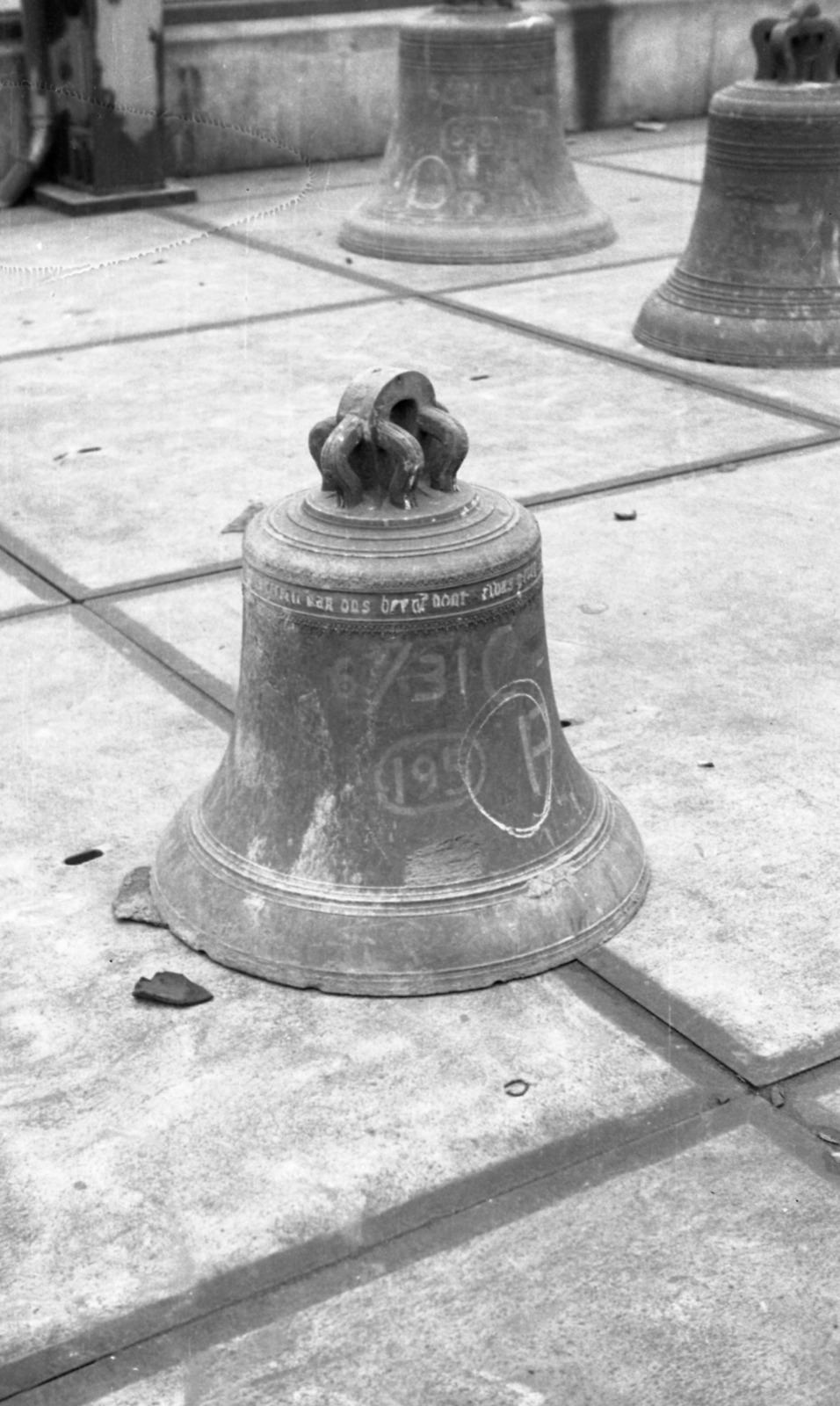 Gt: Waghevens? Gj: 1550 . Dm: 25 cm. Gw: 12 kg. Rn: 10-C-2.P. Ug: 19-3-1943. Vv: Breskens. Opschrift: IC BEN GHEGOOTEN INT JAER XVcL. Figuurreliëfs: l. zeemeermin - 2. non? - 3. doek van Veronica.