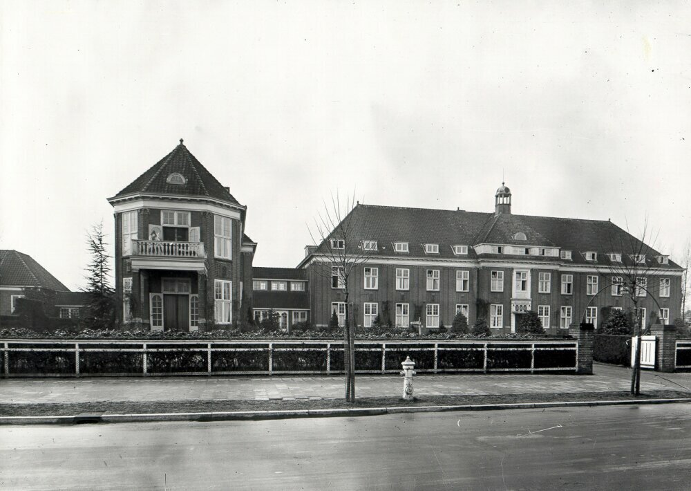 Het Gemeenteziekenhuis aan de Nassaulaan. Op de voorgrond een stuk van de tuin van het ziekenhuis.