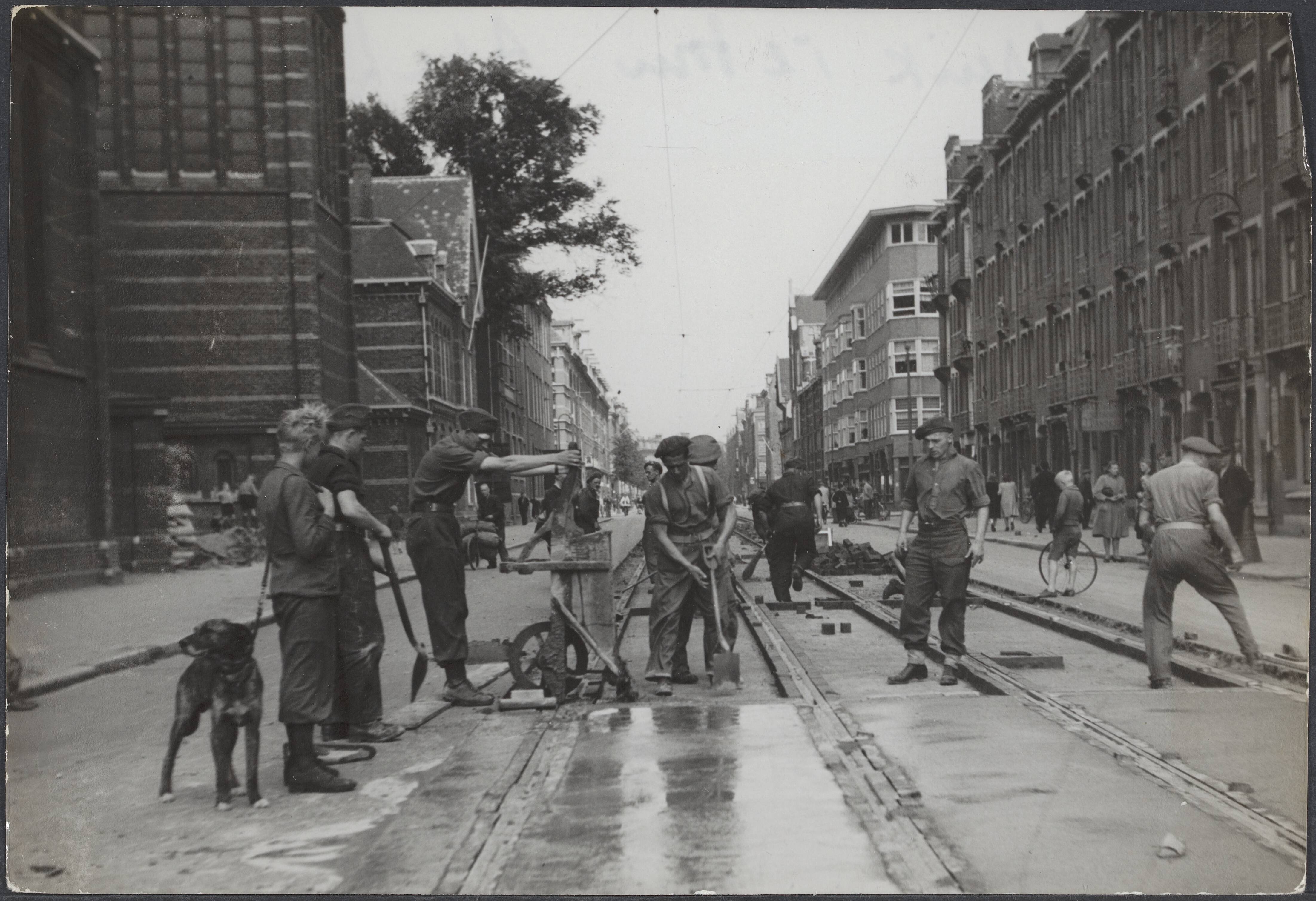 Spaarndammerstraat, Amsterdam (bij de H. Maria Magdalenakerk). Onder leiding van de kapitein J. Breman is de 2e Genie Compagnie te Amsterdam begonnen met herstelwerkzaamheden en het uit de weg ruimen van verkeersbelemmeringen, ondergelopen kelders leeg te pompen