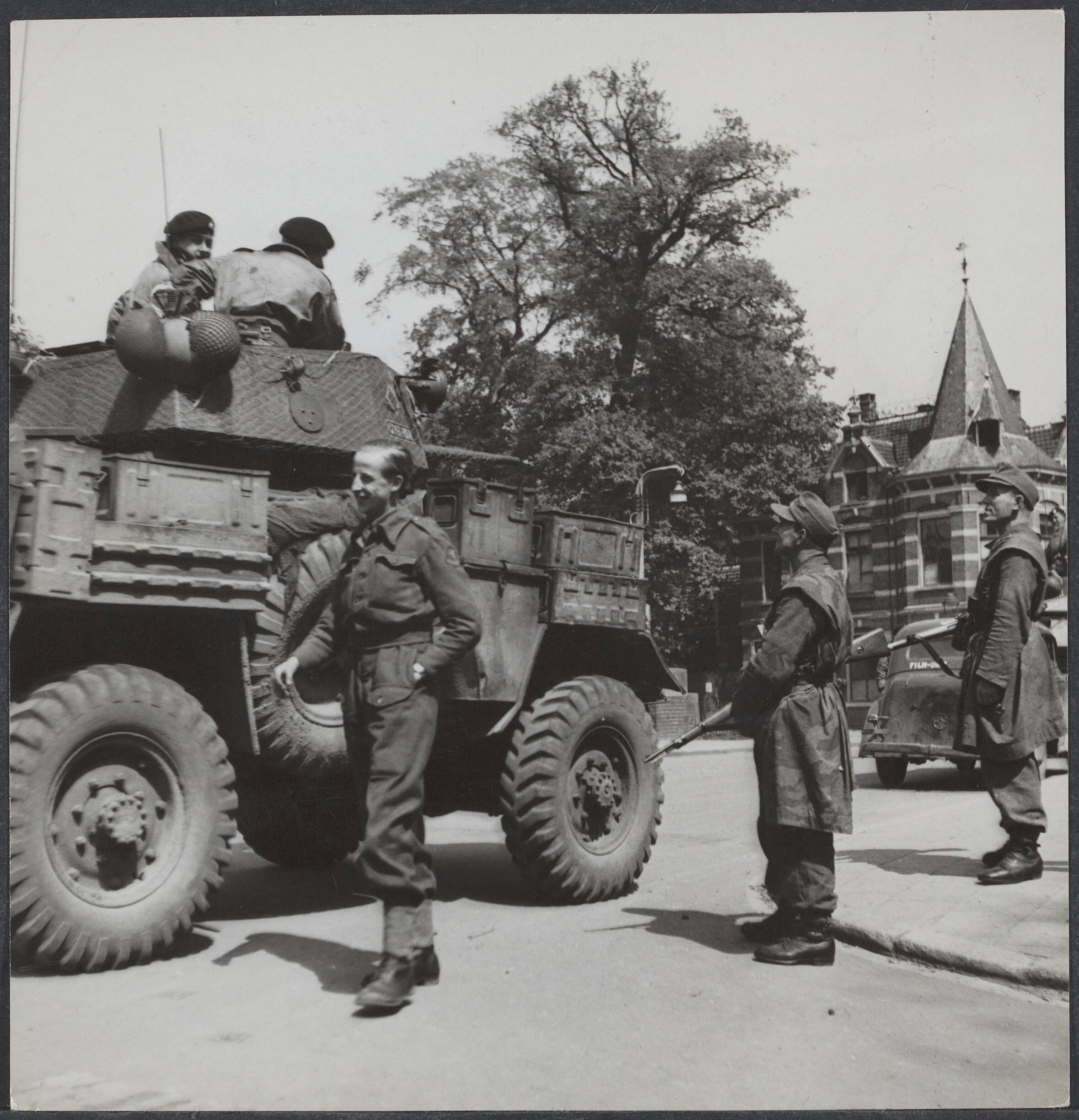 Bevrijding van Amersfoort. Britse pantserwagens na de capitulatie bekeken door (nog) gewapende Duitse militairen