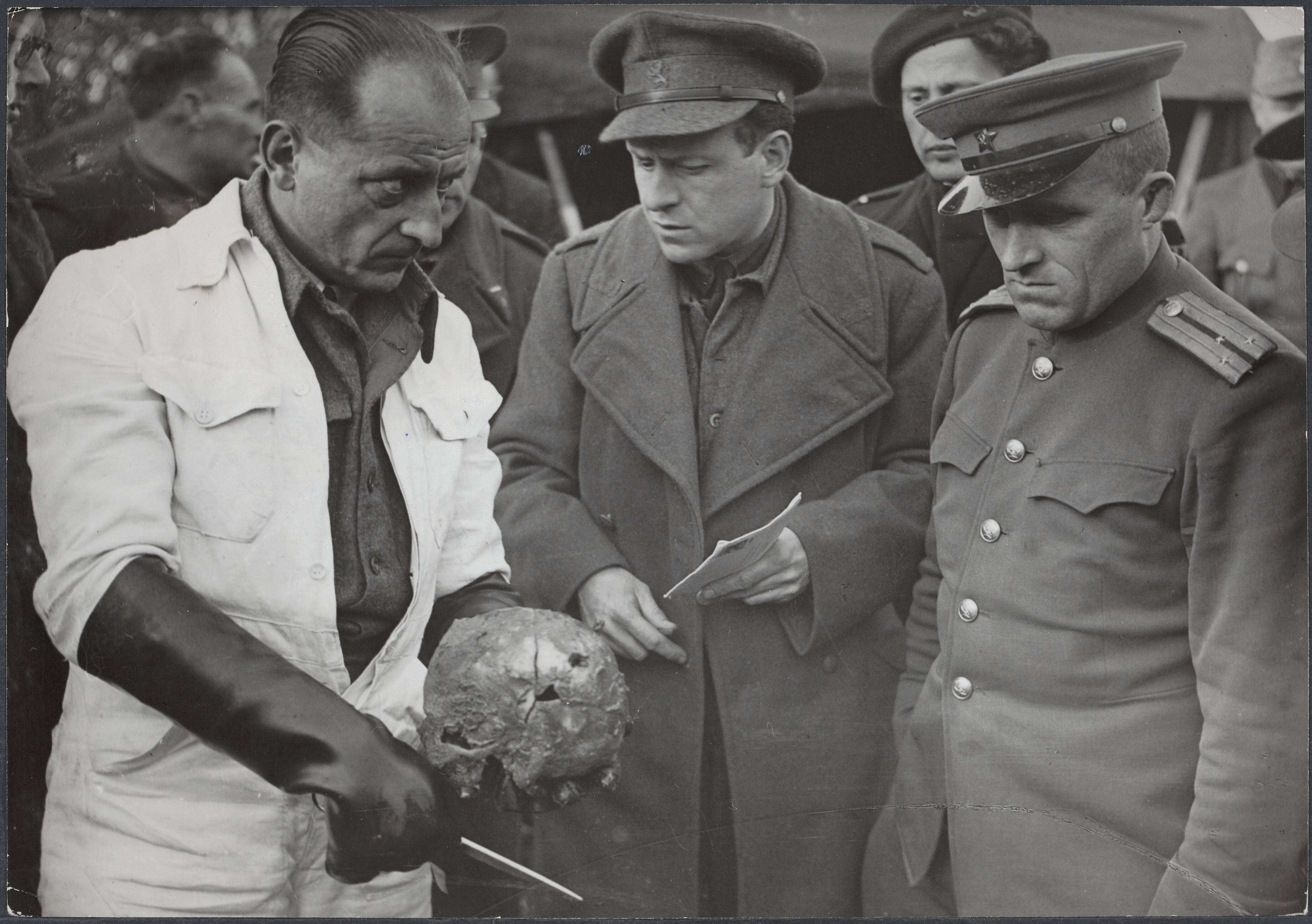 Luitenant N.N. Sagarof van de Russische Missie in Nederland (r) bekijkt een opgegraven schedel waarin twee kogelgaten nog duidelijk zichtbaar zijn