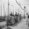 Feesten en kermis te Volendam, na de bevrijding. Kinderen trekken in optocht door de Volendamse straten met trommels van Engelse koekjesblikken