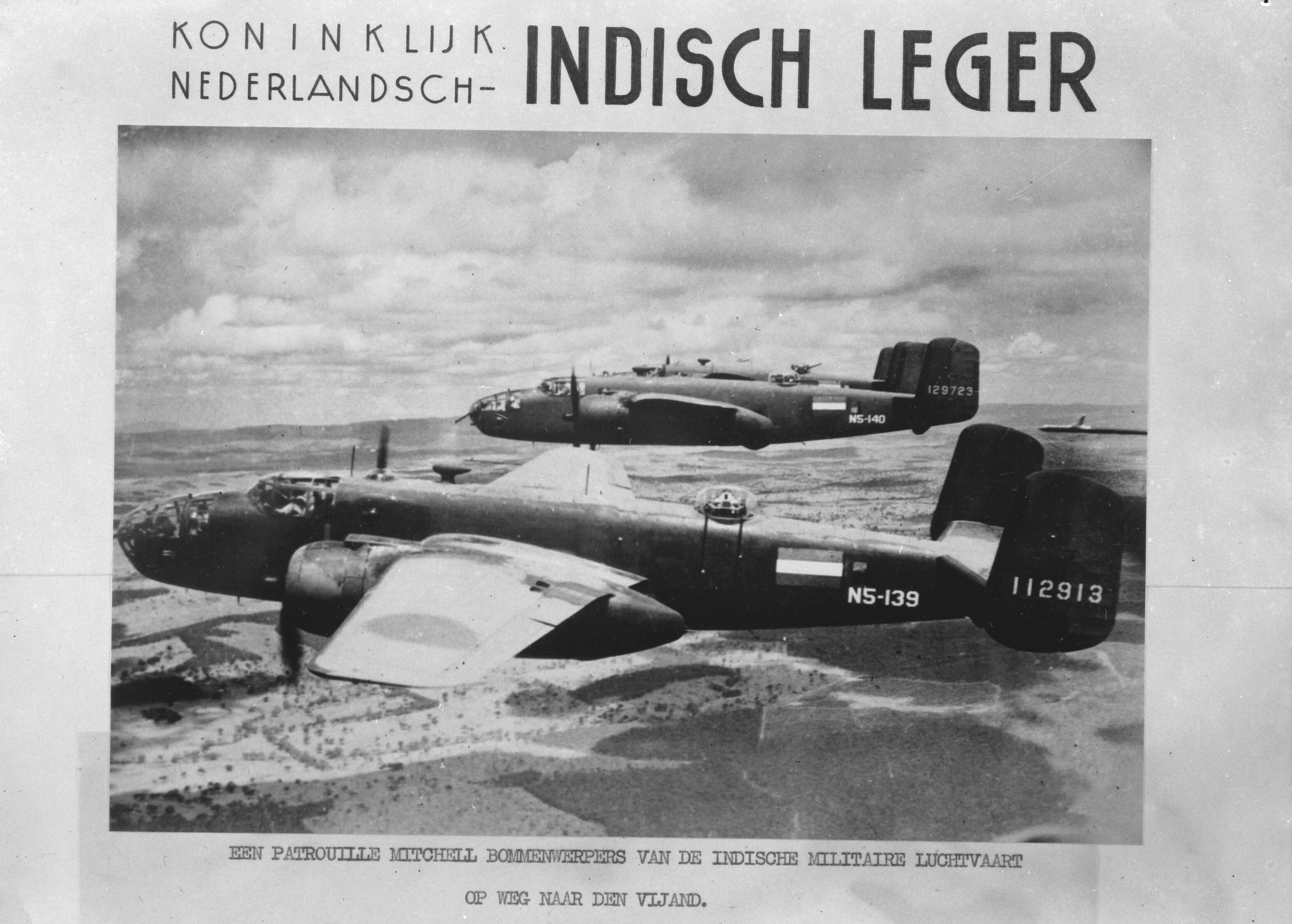 Een patrouille Mitchell bommenwerpers van de Indische Militaire Luchtvaart op weg naar de vijand