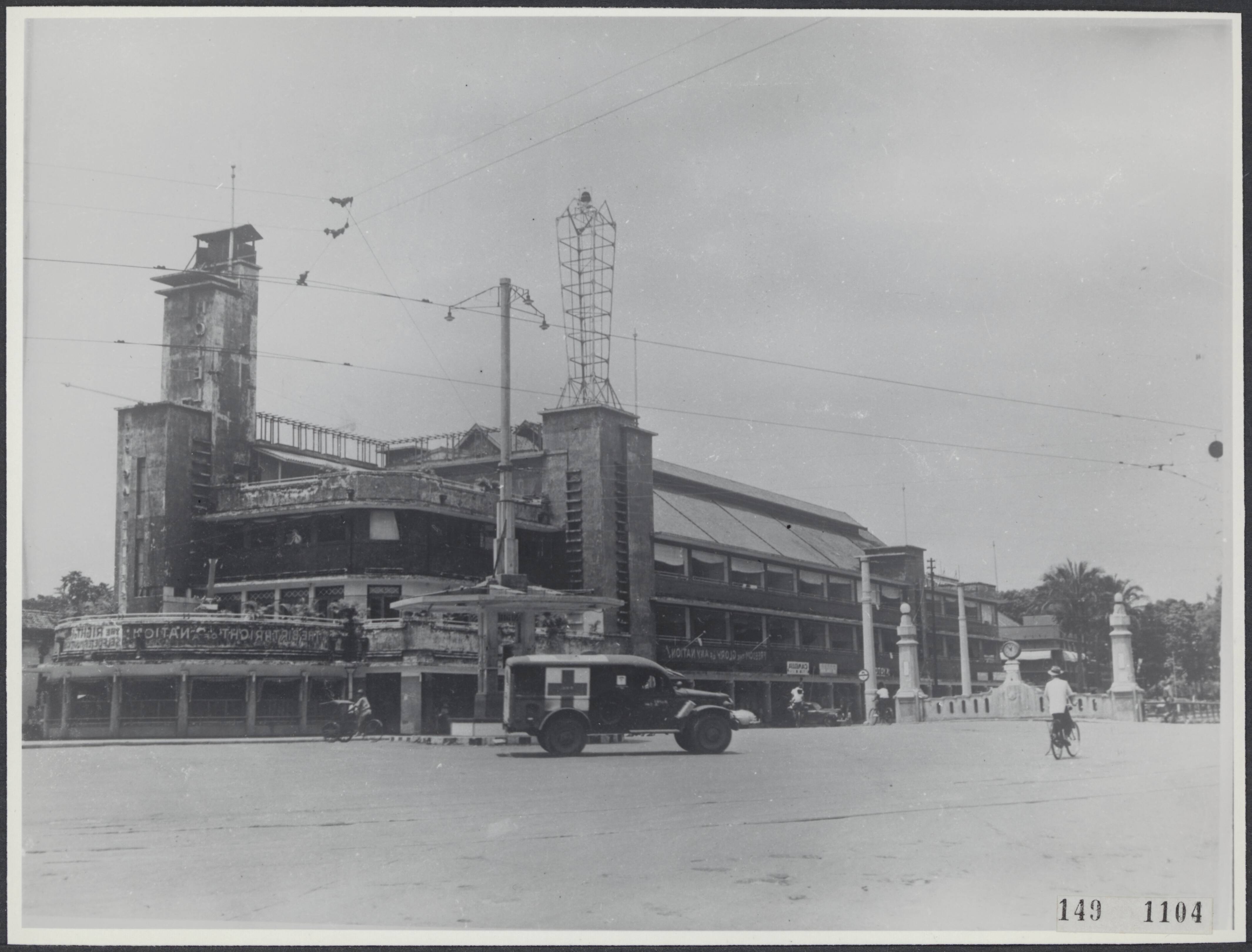 Intocht Britse troepen in Batavia. Hotel des Galleries aan het Molenvliet, gebruikt voor huisvesting van Britse militairen in Batavia (getooid met Indonesische onafhankelijkheidsleuzen). Ervoor staat een ambulance