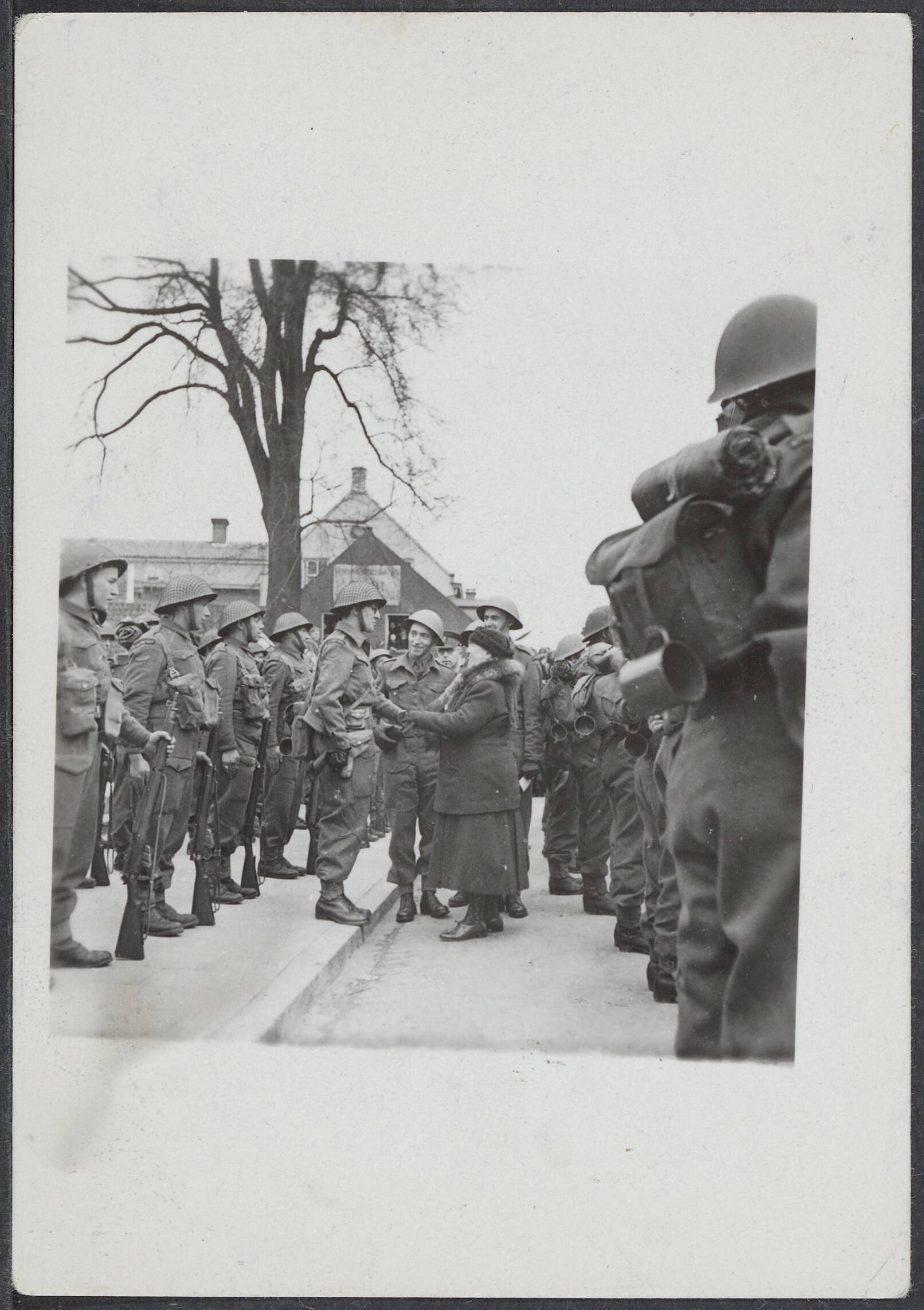 Koningin Wilhelmina tijdens ontmoeting met soldaten in Tilburg