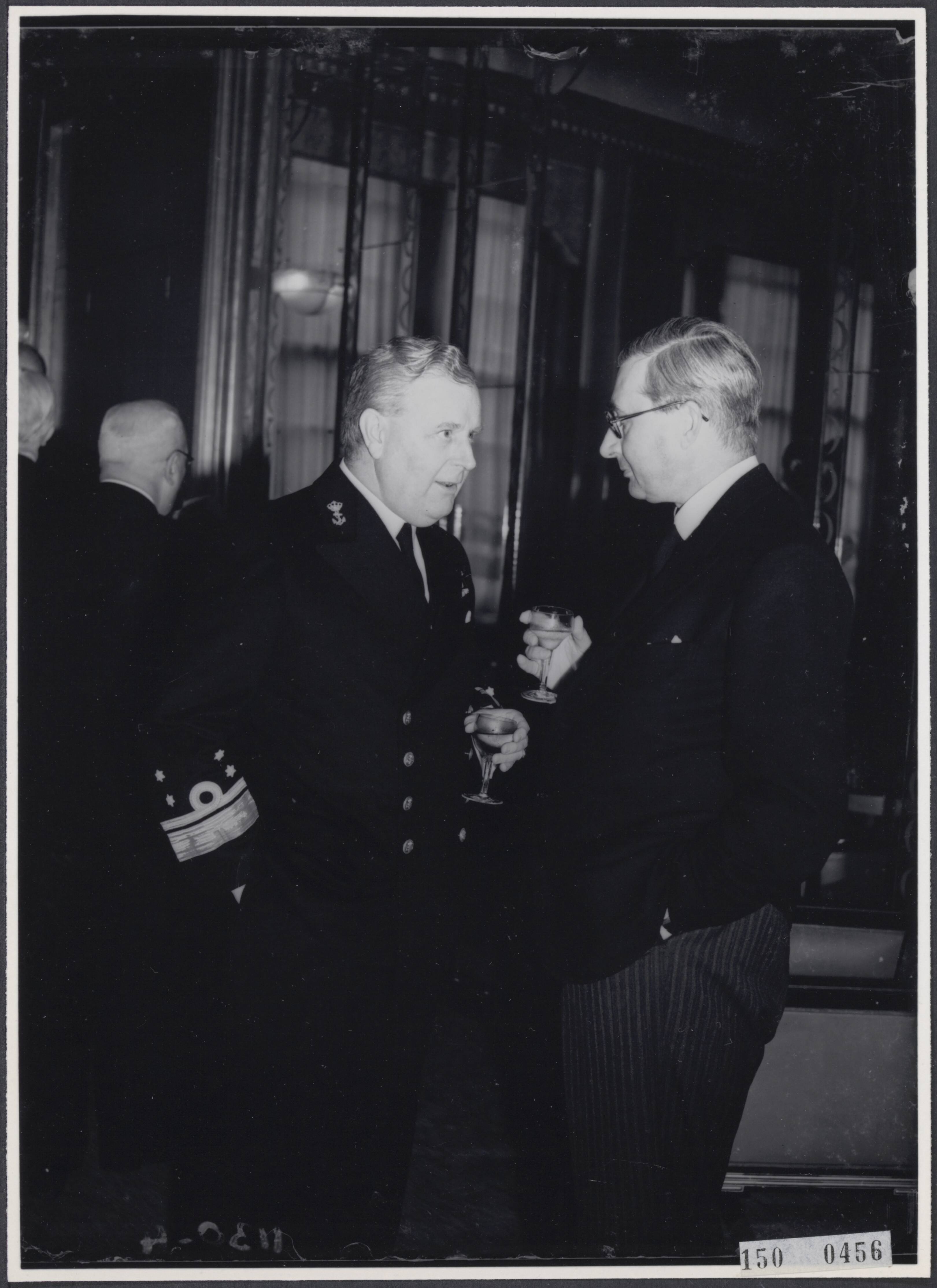 Nederlandse club "Oranjehaven" in Londen. Links de bevelhebber der zeestrijdkrachten en tevens minister van Marine, luitenant admiraal J.Th. Furstner in gesprek met ?