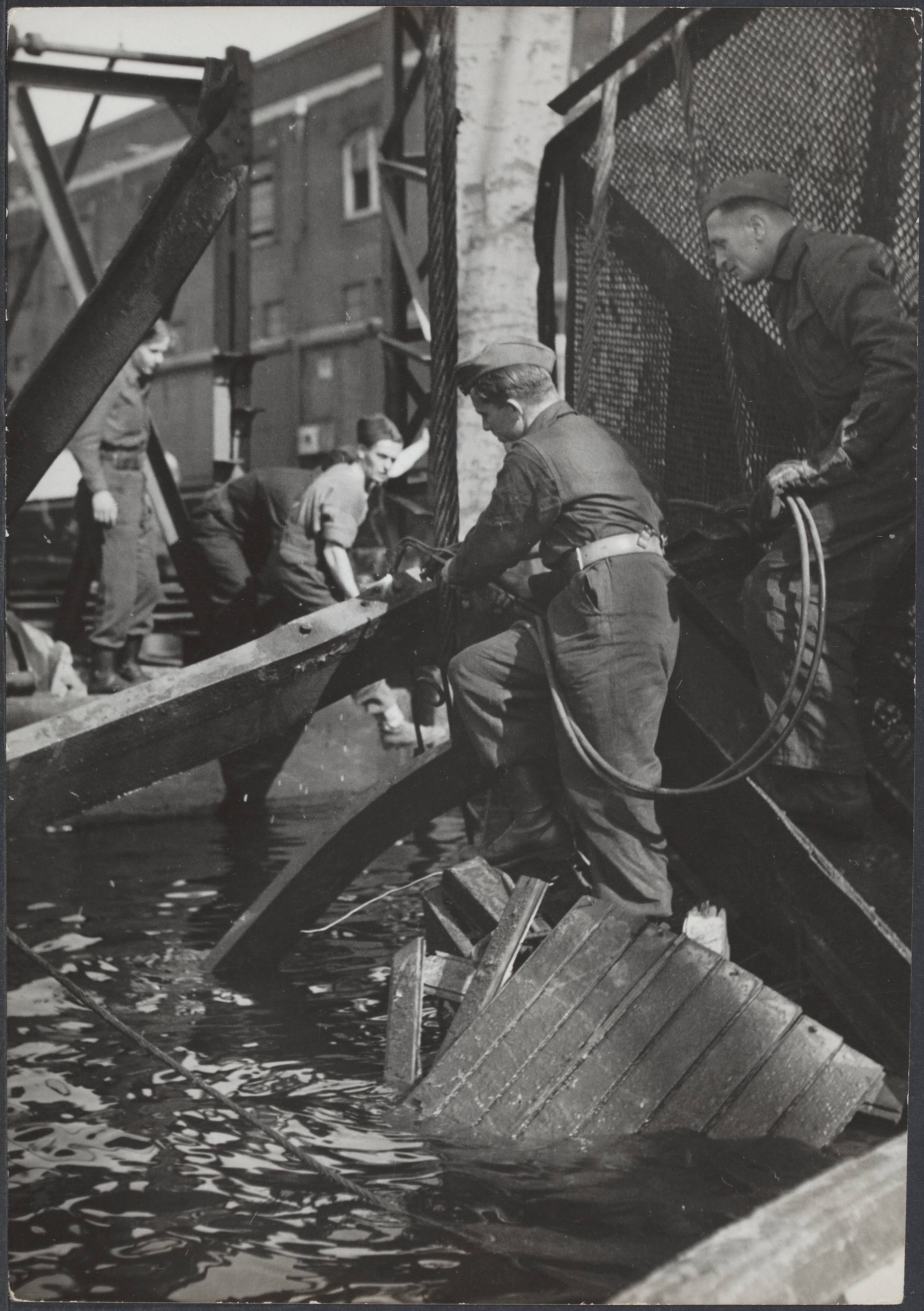 Mannen van de 2e Nederlandse Genie Compagnie bij het optakelen van een gezonken kraan