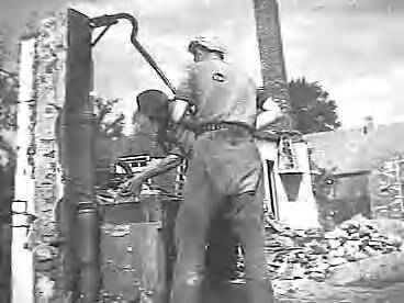 Arbeiders bij een waterpomp tussen verwoeste gebouwen