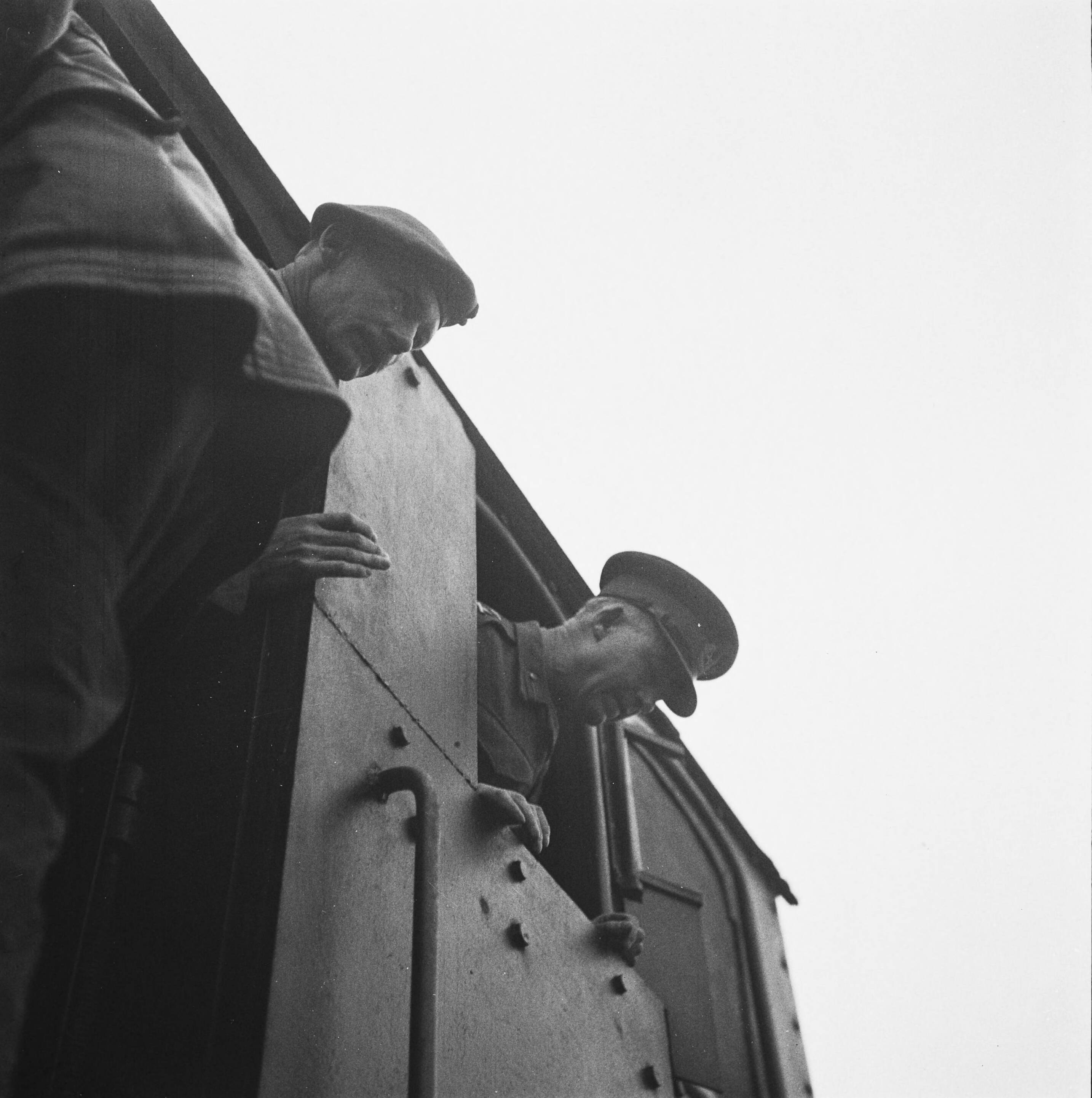 De eerste trein passeert de nieuwe brug een Jumbo 3705, met een verloftrein van Canadese militairen uit Hannover (Duitsland) Generaal-majoor D.J. MacMullen, de ontwerper van de brug, kijkt vanuit de stuurcabine van de locomotief naar zijn brug