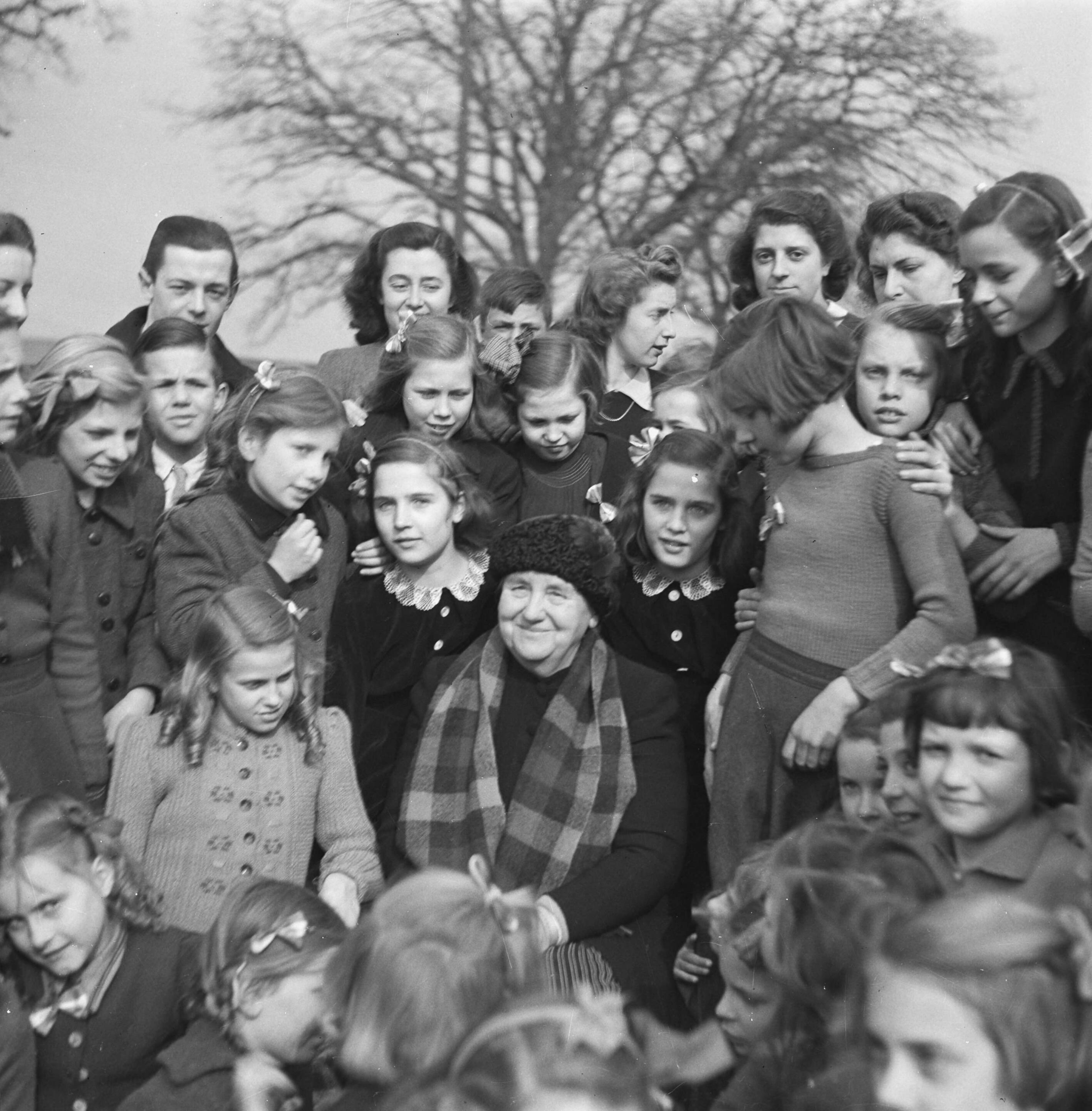 Koningin Wilhelmina bezoekt het kamp te Baginton Coventry in Engeland, waar Nederlandse kinderen uit bevrijd Nederland voor recupe...