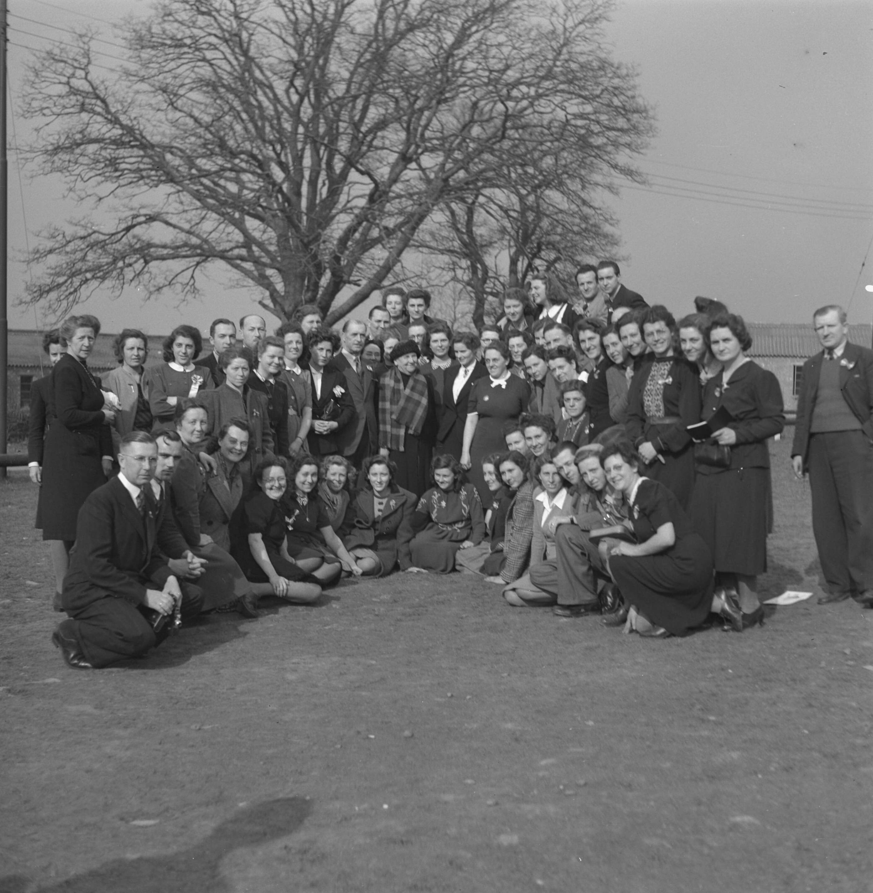 Koningin Wilhelmina bezoekt het kamp te Baginton Coventry waar Nederlandse kinderen, overgebracht uit bevrijd Nederlands gebied recupereren. Groepsfoto