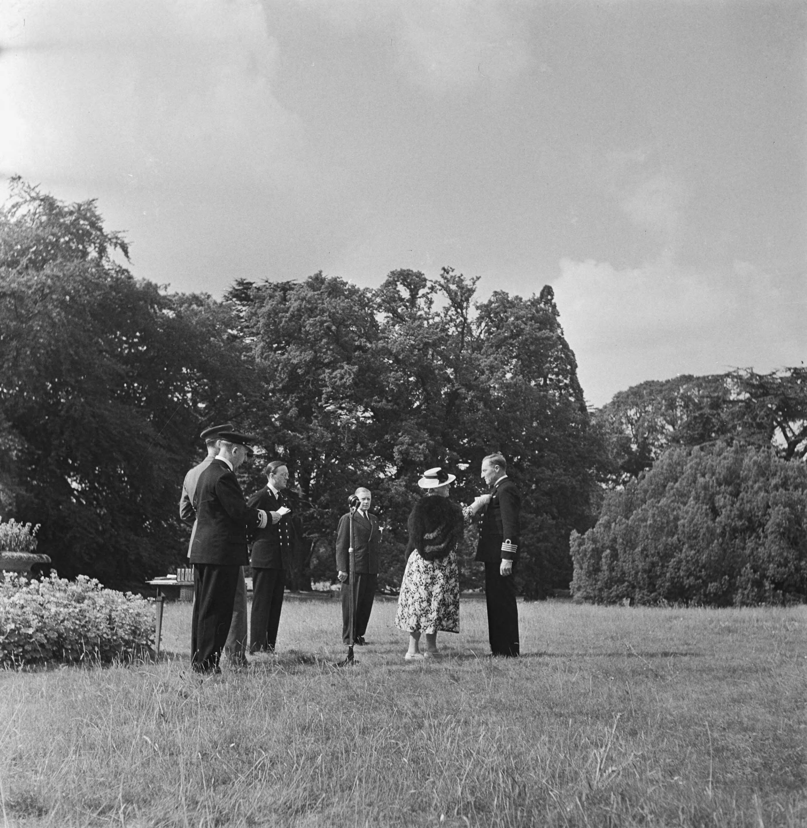 Koningin Wilhelmina reikt onderscheidingen uit in de tuin van haar privé-verblijf in Engeland Stubbings House, Maidenhead
