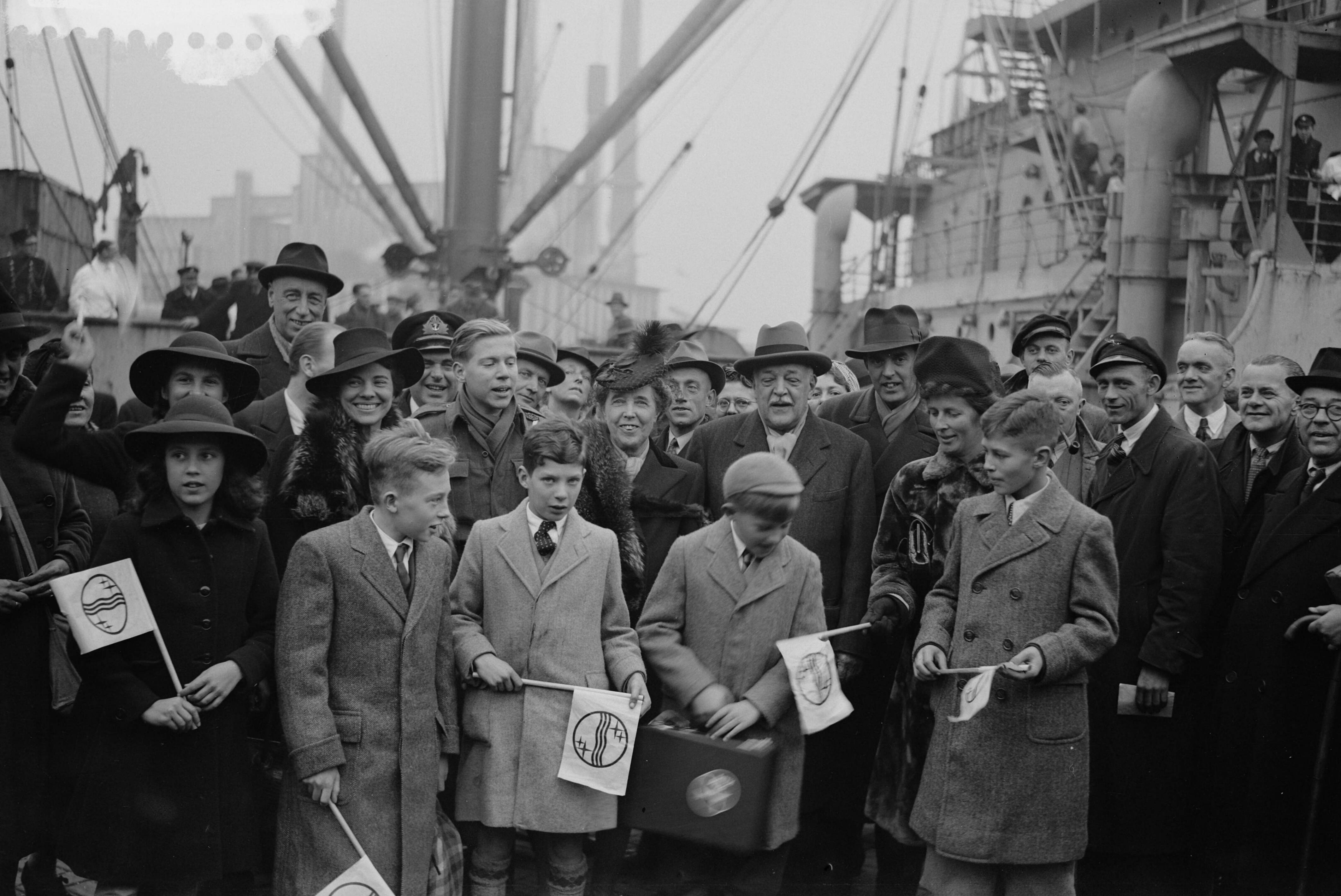 Opening veerdienst lijn Hoek van Holland-Harwich Dr. Anton Philips met zijn vrouw temidden van andere passagiers en kinderen met Philips vlaggetjes
