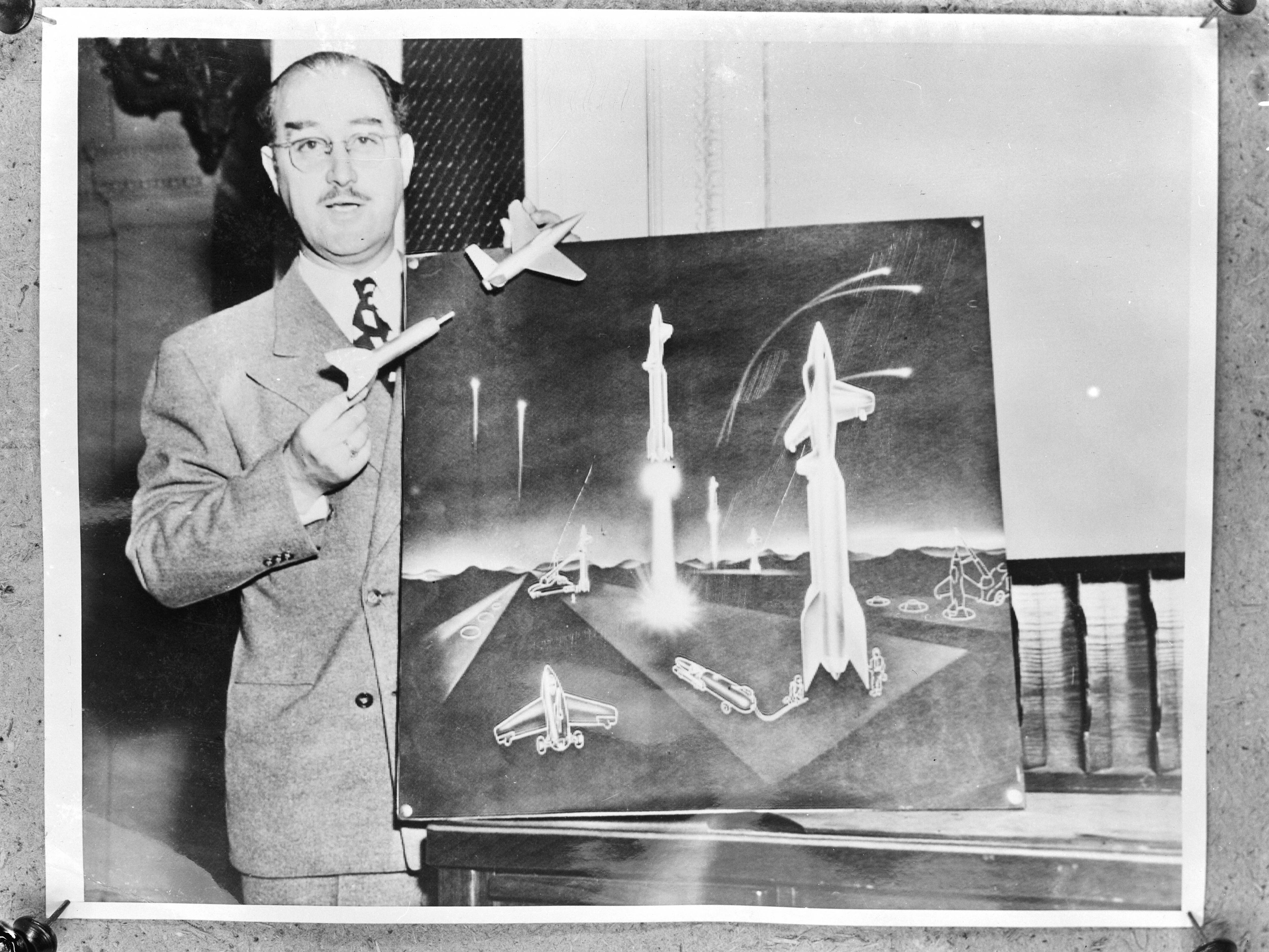 Atoomwapen presentatie met raketten en vliegtuigen, red.