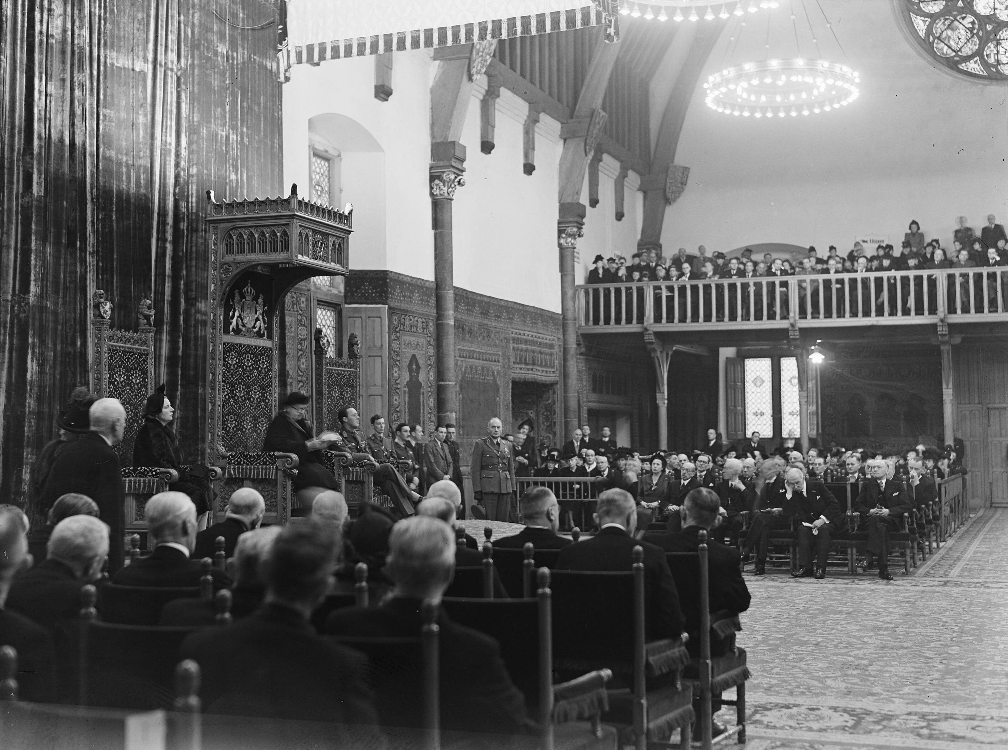 Koningin Wilhelmina wordt geflankeerd door prinses Juliana en prins Bernhard