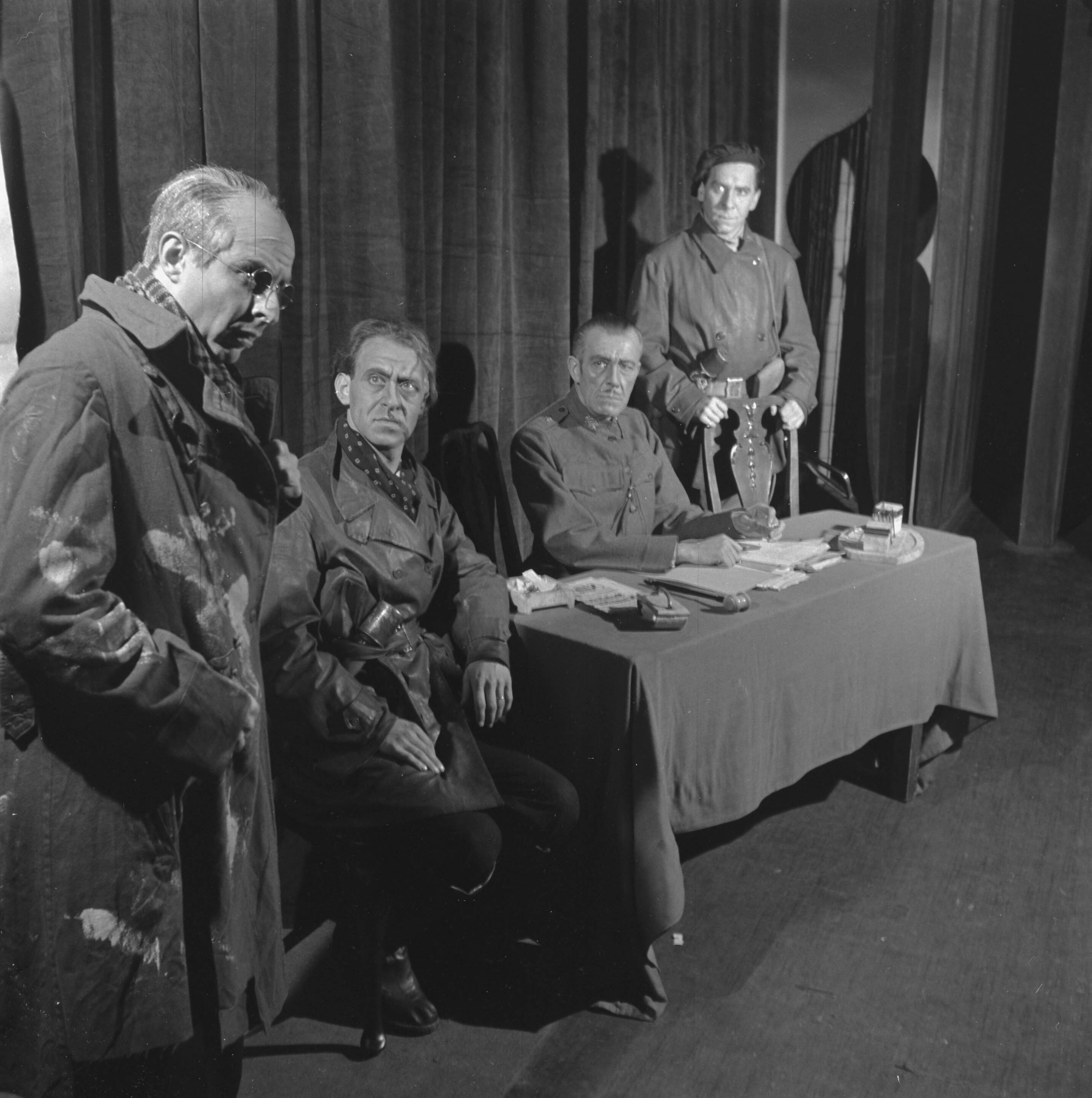 Scene uit "De vijfde colonne" (Ernest Hemingway) door Toneelgroep Comedia. Vlnr. Fons Rademakers, Bob de Lange, Cor Hermus, Joan Remmelts
