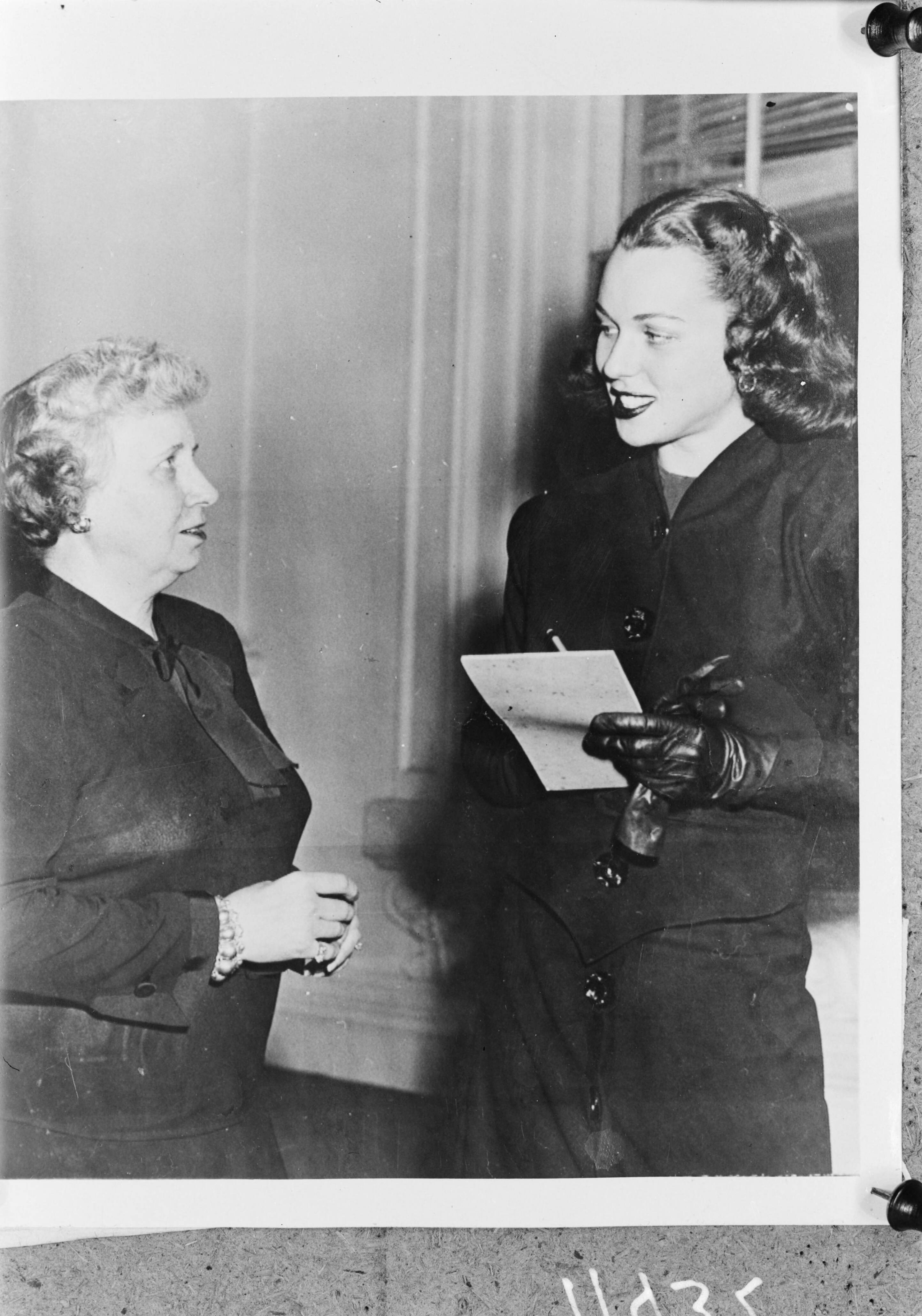 foto heeft geen beschrijving. Waarschijnlijk uit Amerika. Twee vrouwen waarvan jongere rechts een notitieblaadje in gehandschoende hand heeft. Interview?