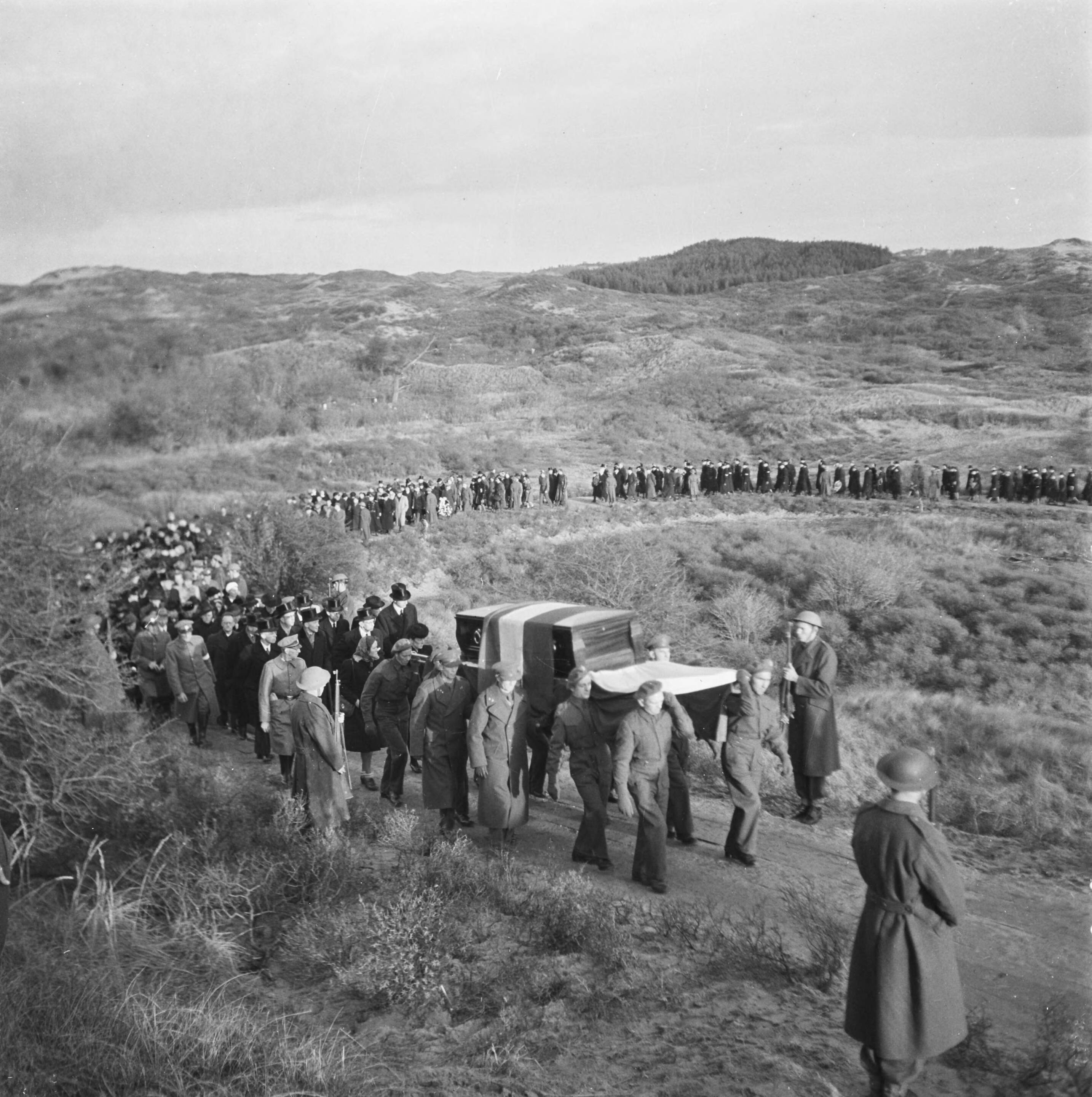Serie: plechtige bijzetting van de stoffelijke resten van 400 illegale strijders op de begraafplaats aan de Zeeweg te Overveen. Begrafenisstoet in de duinen