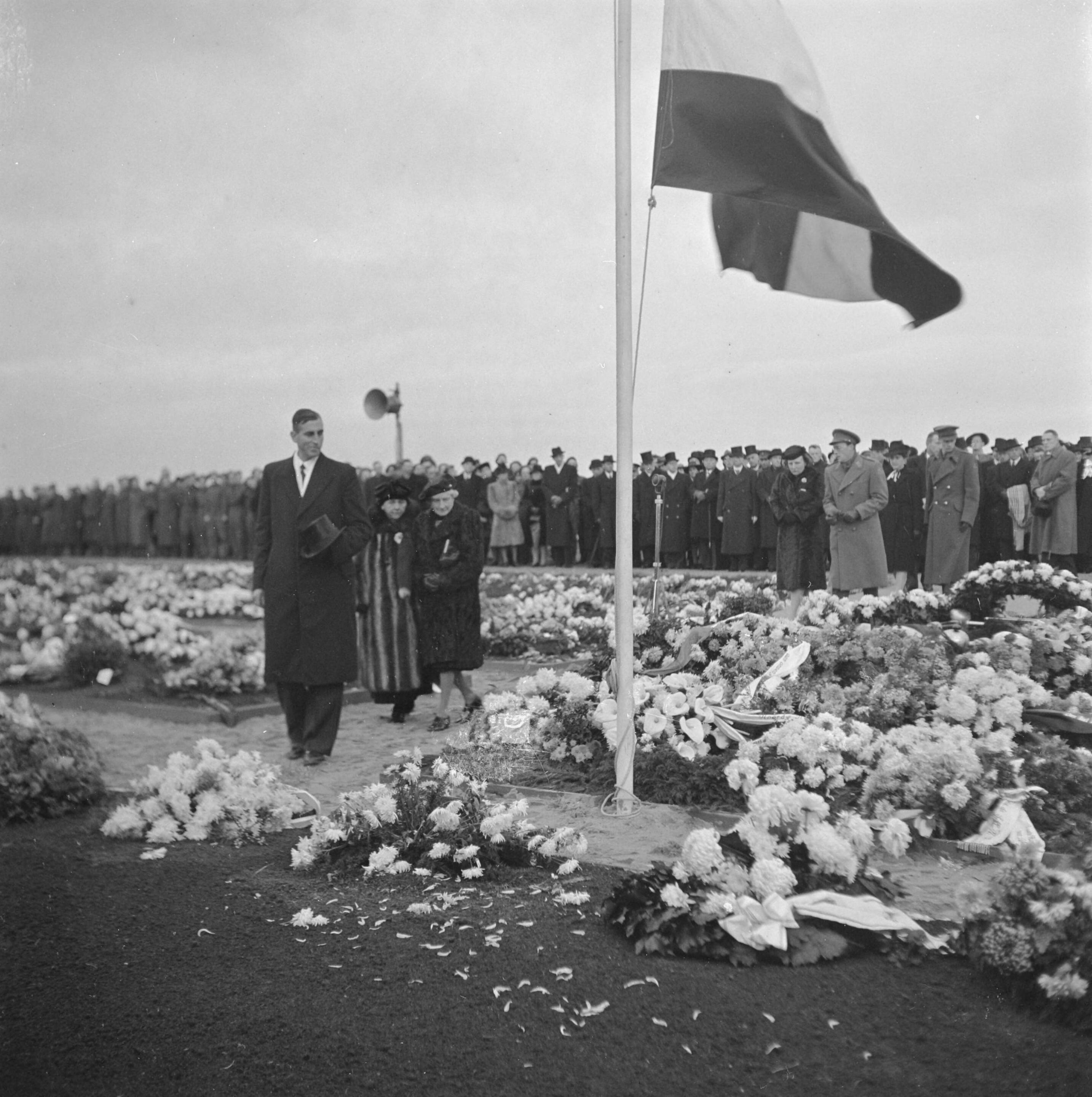 Begrafenis illegale strijders in Overveen, Koningin Wilhelmina eert de gevallenen