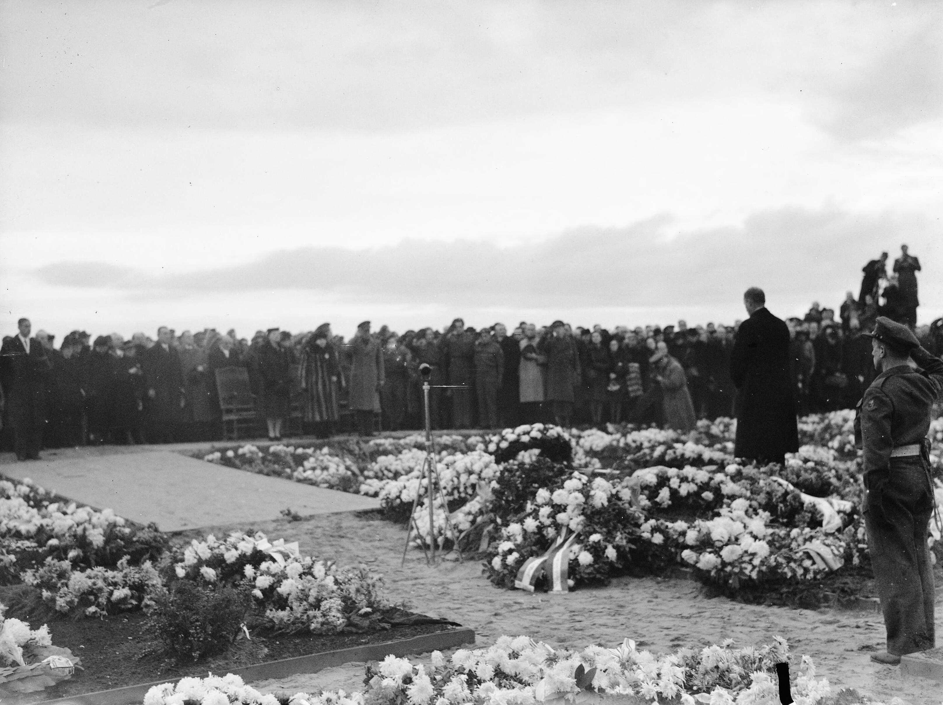 Plechtige bijzetting van de stoffelijke resten van 400 illegale strijders op de begraafplaats aan de Zeeweg te Overveen.