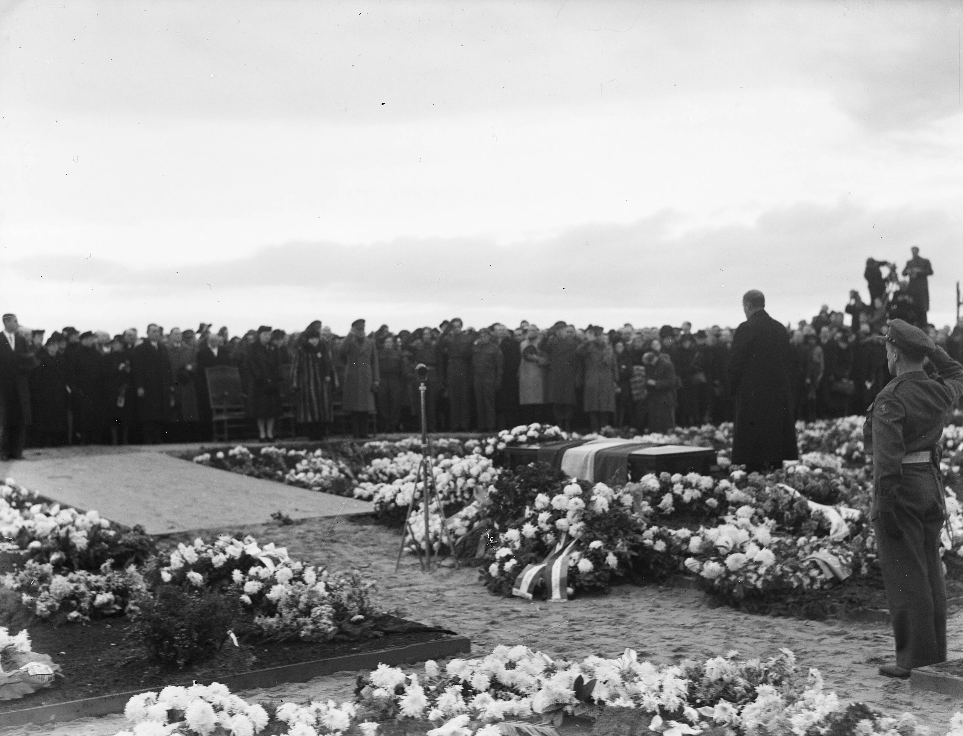 Plechtige bijzetting van de stoffelijke resten van 400 illegale strijders op de begraafplaats aan de Zeeweg te Overveen.