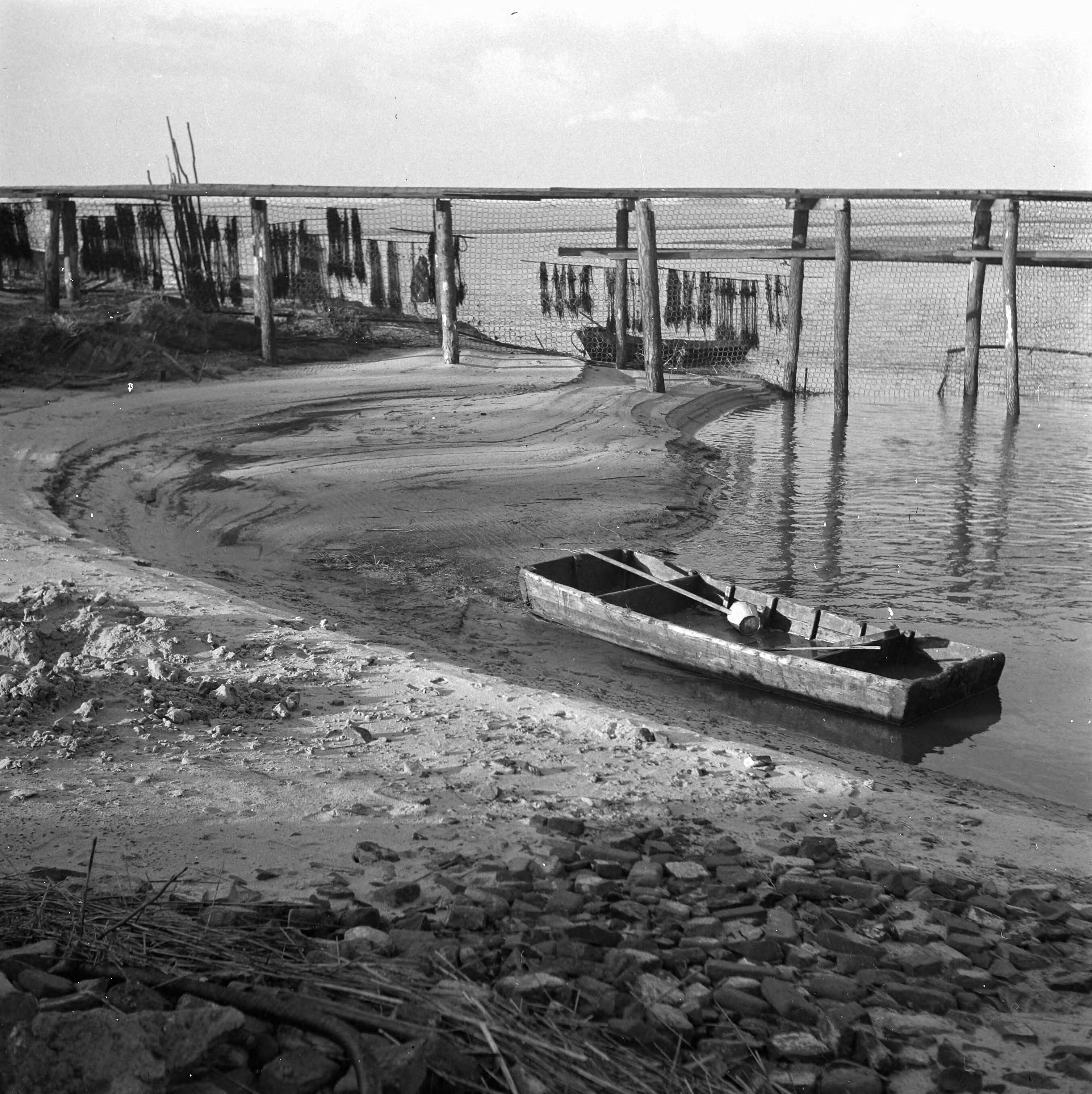 Wieringermeerpolder. Het oeverstrand toont de sporen van de eerdere waterhoogten. Visnetten moeten verhinderen dat drijvende wrakstukken de steiger vernielen. Op de voorgrond een vlot wat gebruikt is bij evacuaties