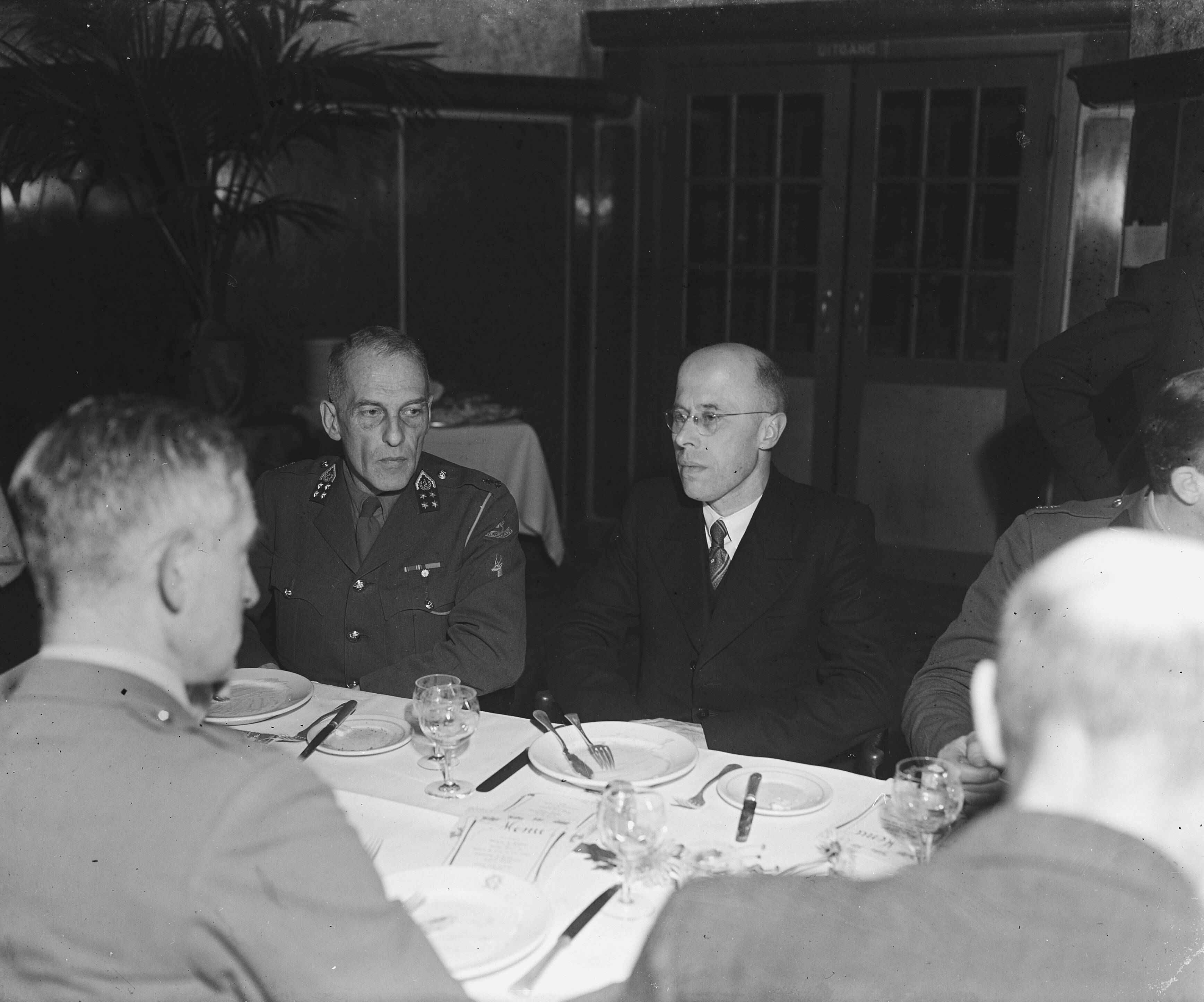 Afscheidsdiner Militair Gezag voor chef-staf generaal H.J. Kruls. In het midden L.J.M. Beel, links naast hem een viersterren-generaal (naam onbekend)