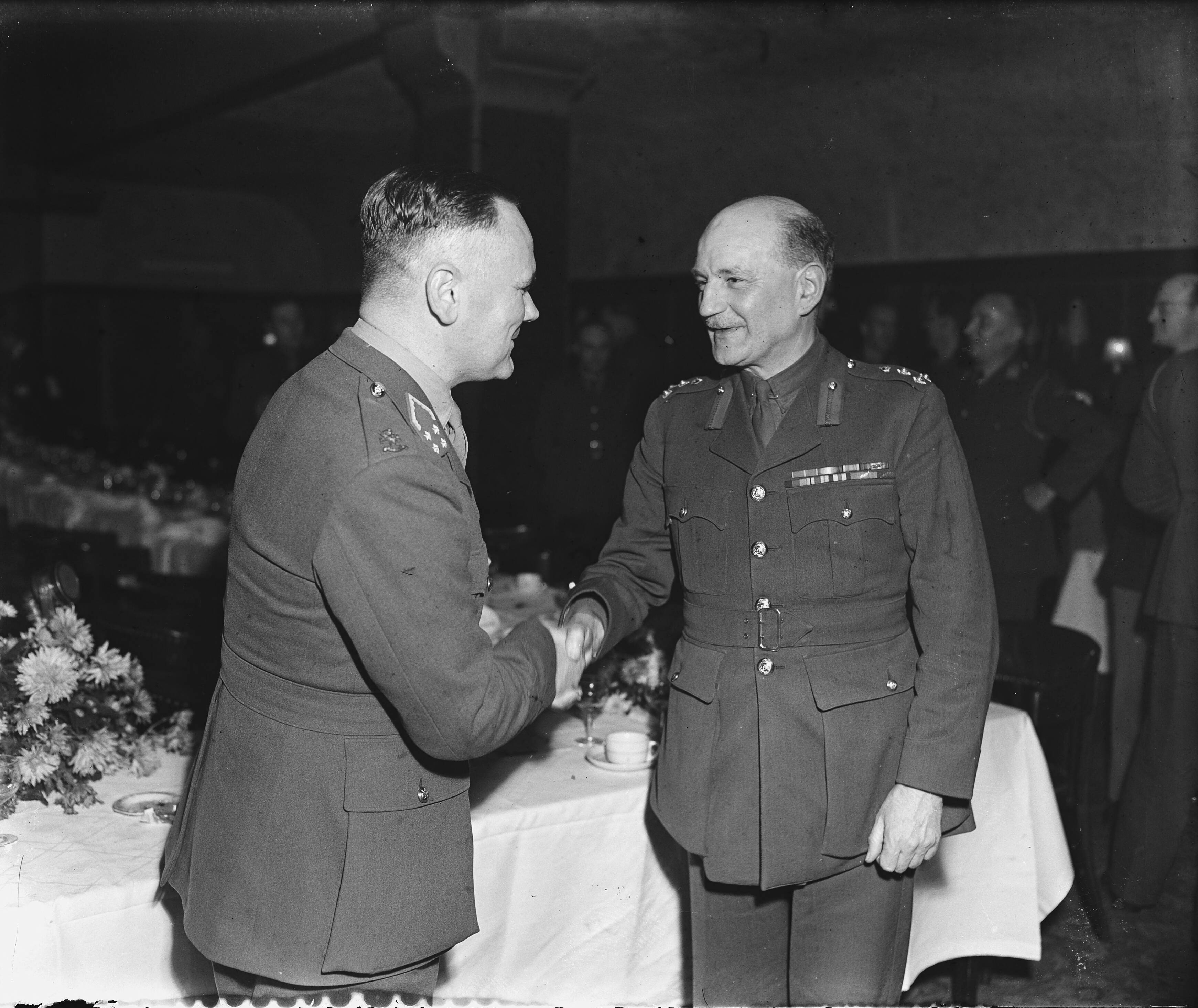 Afscheidsdiner Militair Gezag voor chef-staf generaal H.J. Kruls. H.J. Kruls en een Canadese generaal
