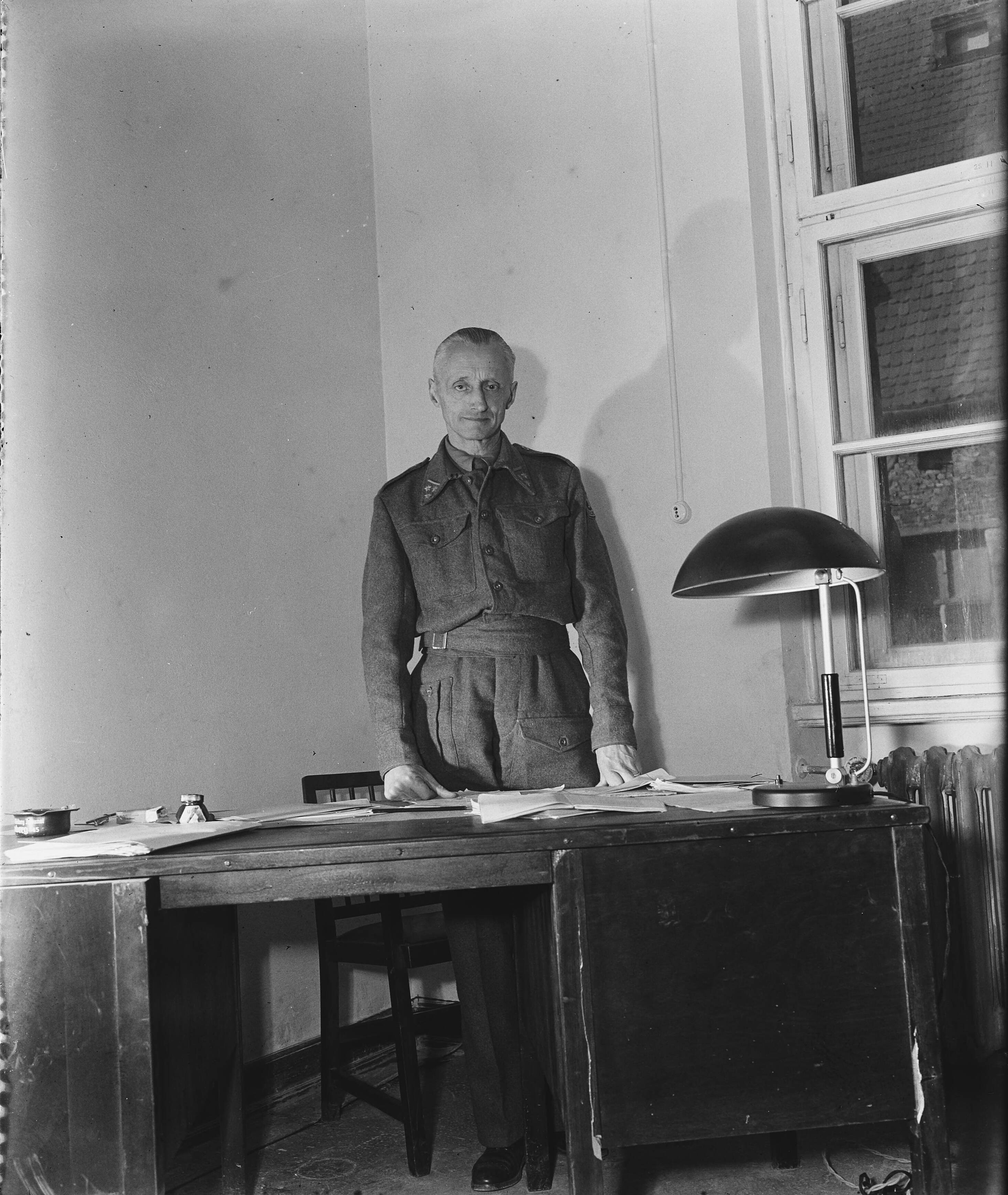 Proces Neurenberg. Kolonel A.M. baron van Tuyll van Serooskerken die Nederland in het proces vertegenwoordigt