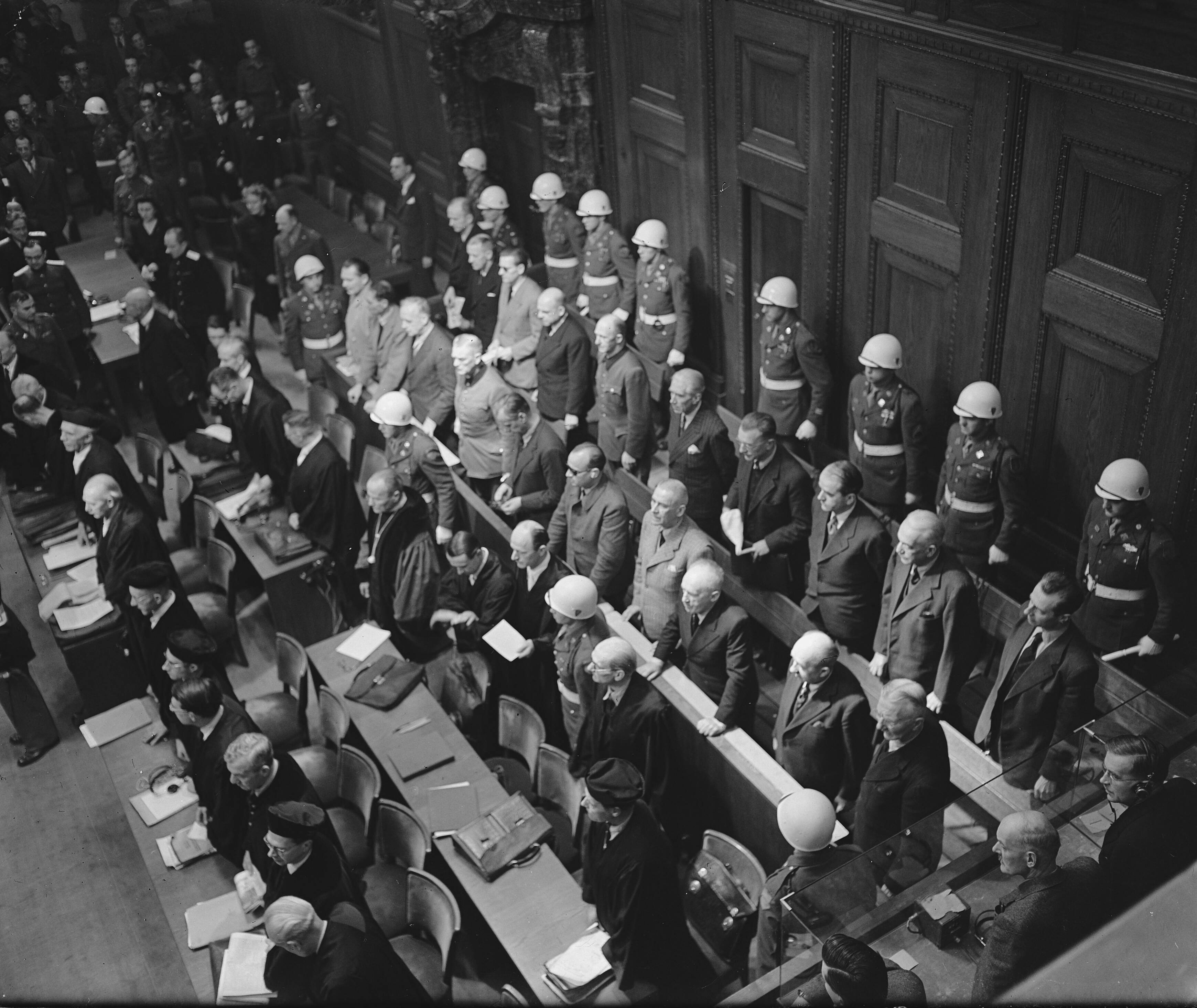 Proces Neurenberg de beklaagdenbank. Beklaagden staan