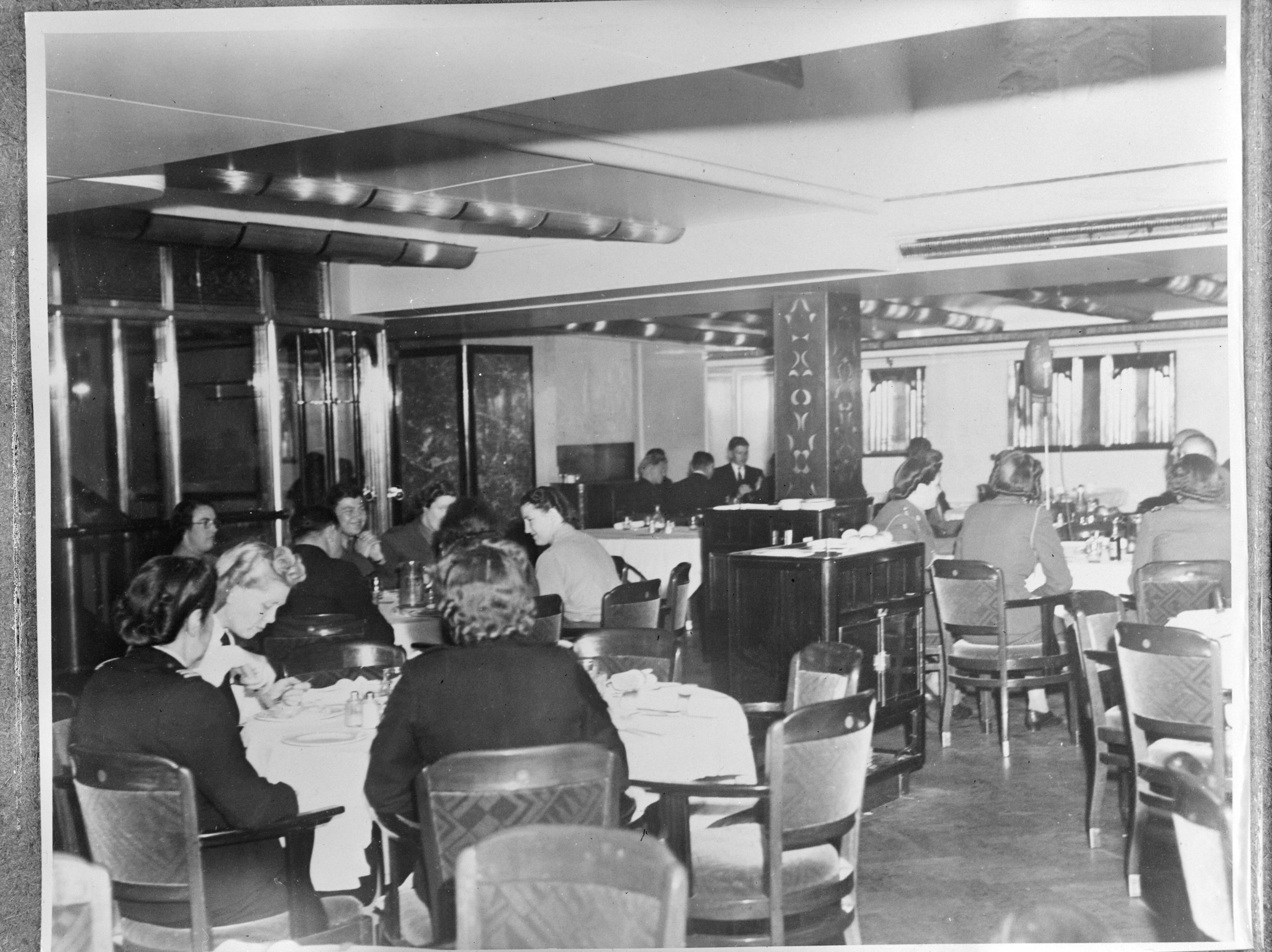 Hospitaalschip "Oranje" verlaat Melbourne voor een hulpmissie naar Batavia. Medewerkers van de medische staf in het 1e klasse restaurant.