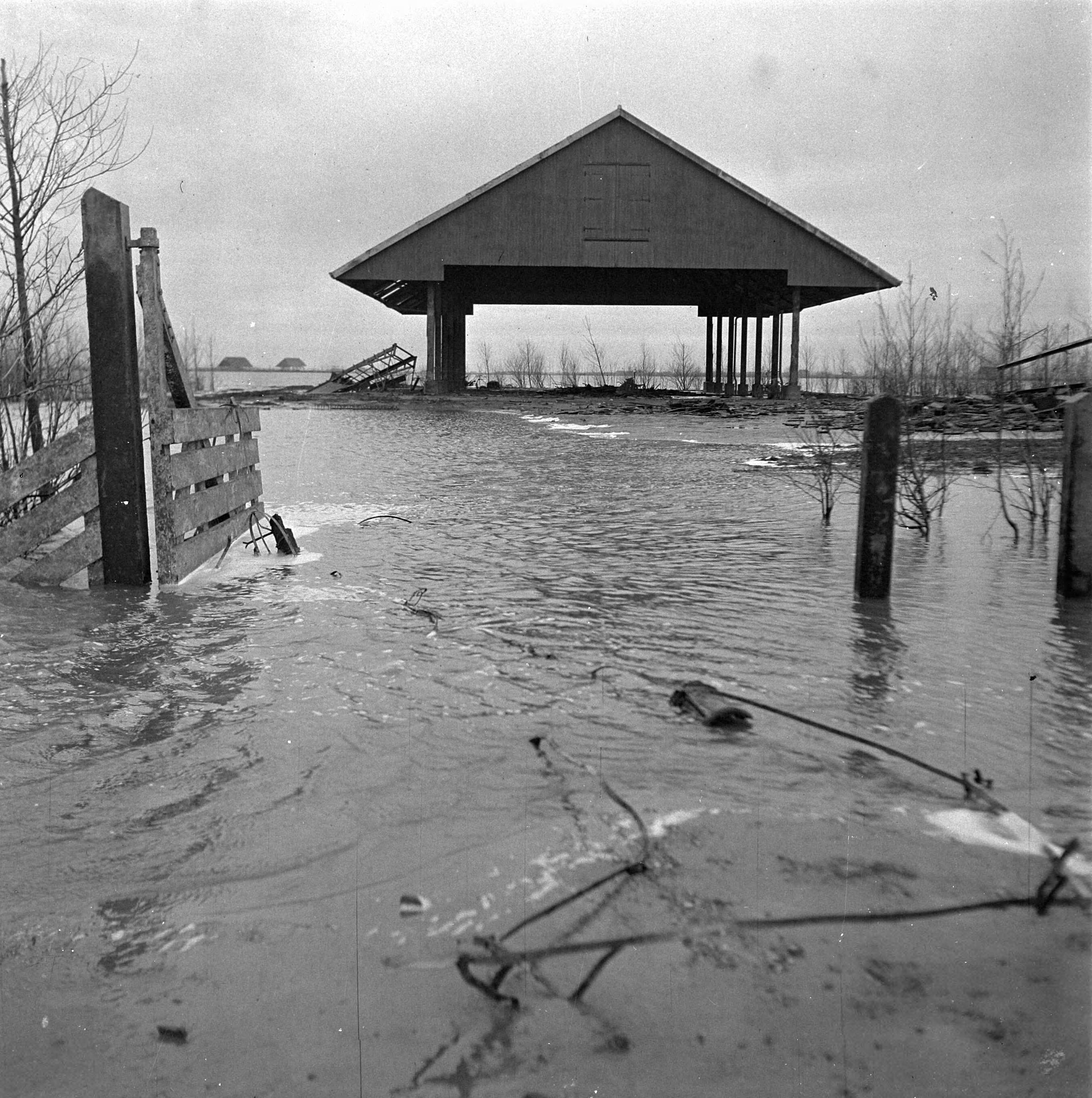 Wieringermeerpolder. Verwoeste landbouwschuur, het bakstenen woonhuis is geheel verdwenen