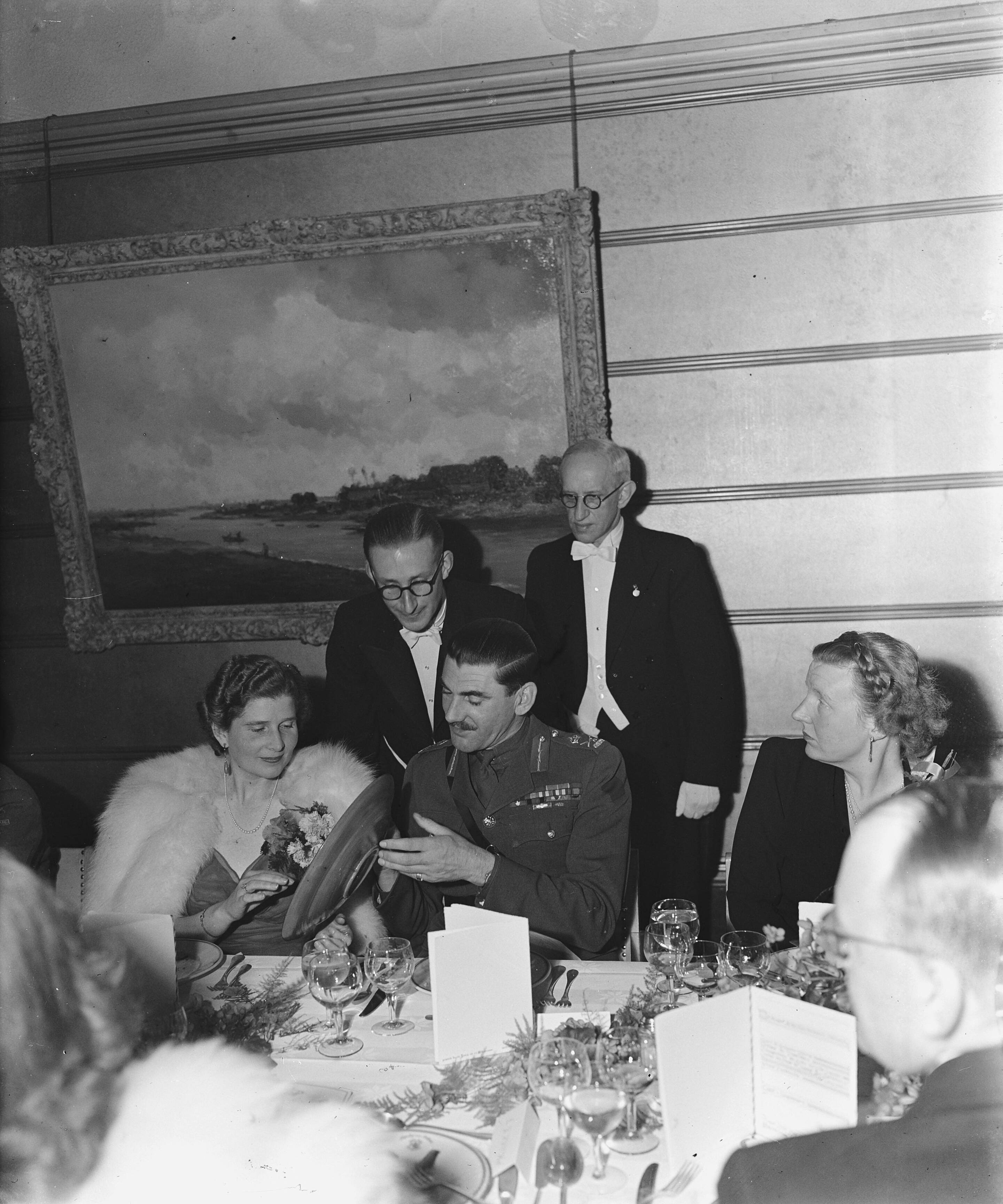 Afscheidsdiner voor de Canadese luitenant-generaal G.G. (Guy Granville) Simonds links naast prinses Juliana, rechts naast hem zijn echtgenote?