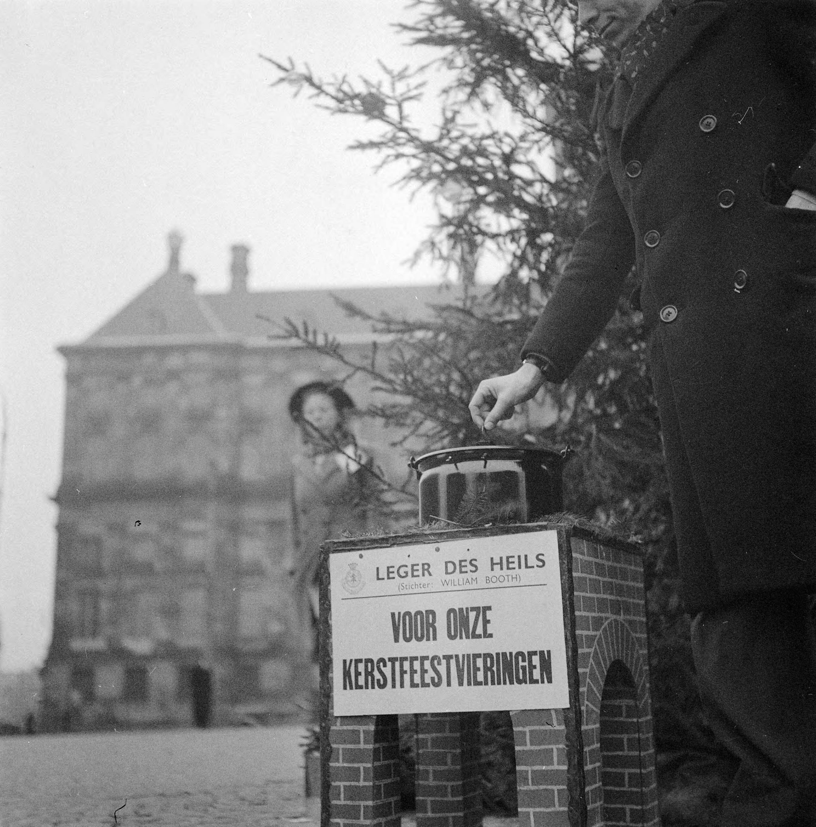 Kerstpot van het Leger des Heils voor het Paleis op de Dam te Amsterdam.