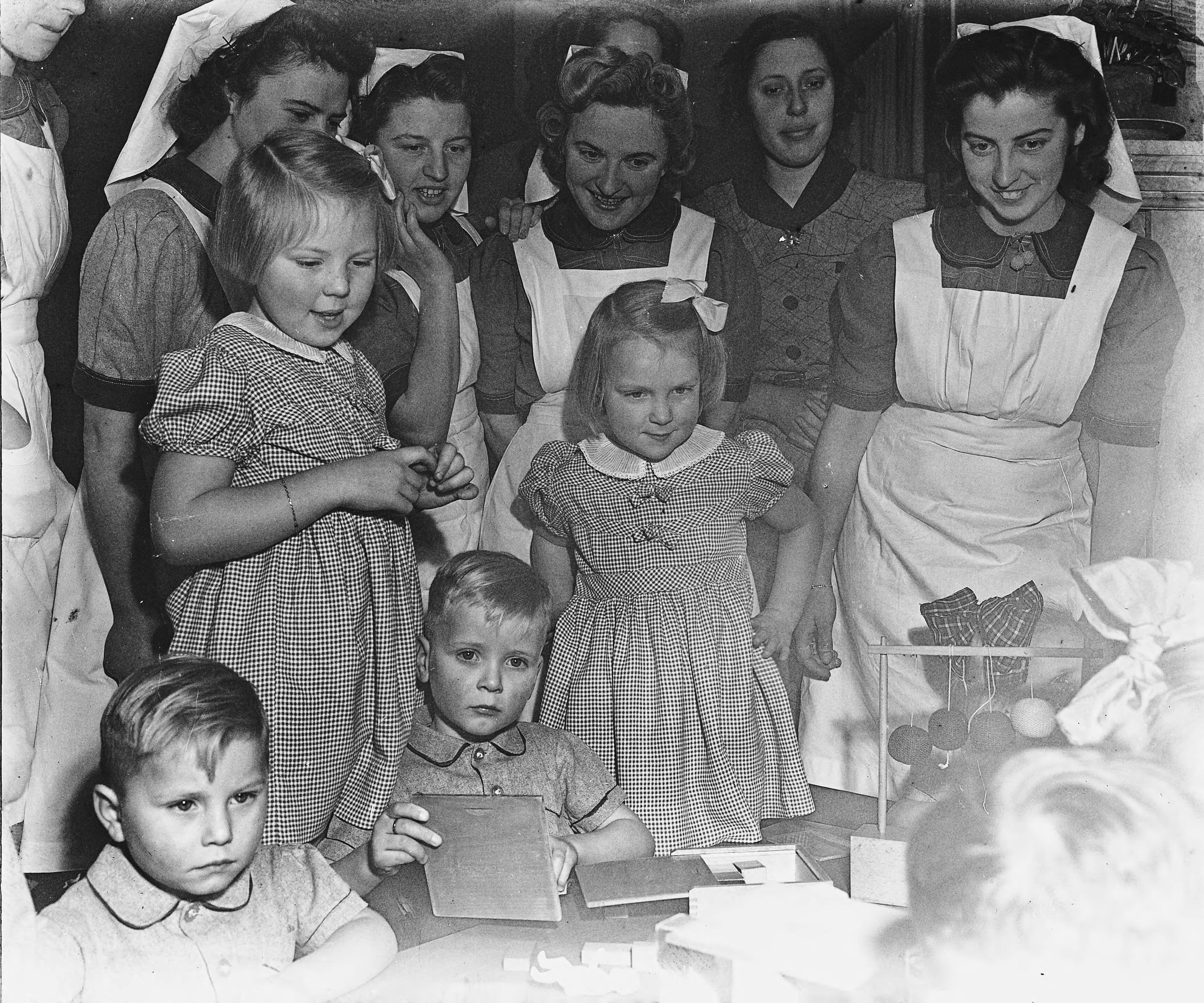 Kinderdagverblijf "Het Kabouterhuis" op de Amsteldijk te Amsterdam. Officiele opening door Prinses Juliana. Prinses Beatrix en prinses Irene tussen kinderen en verpleegsters