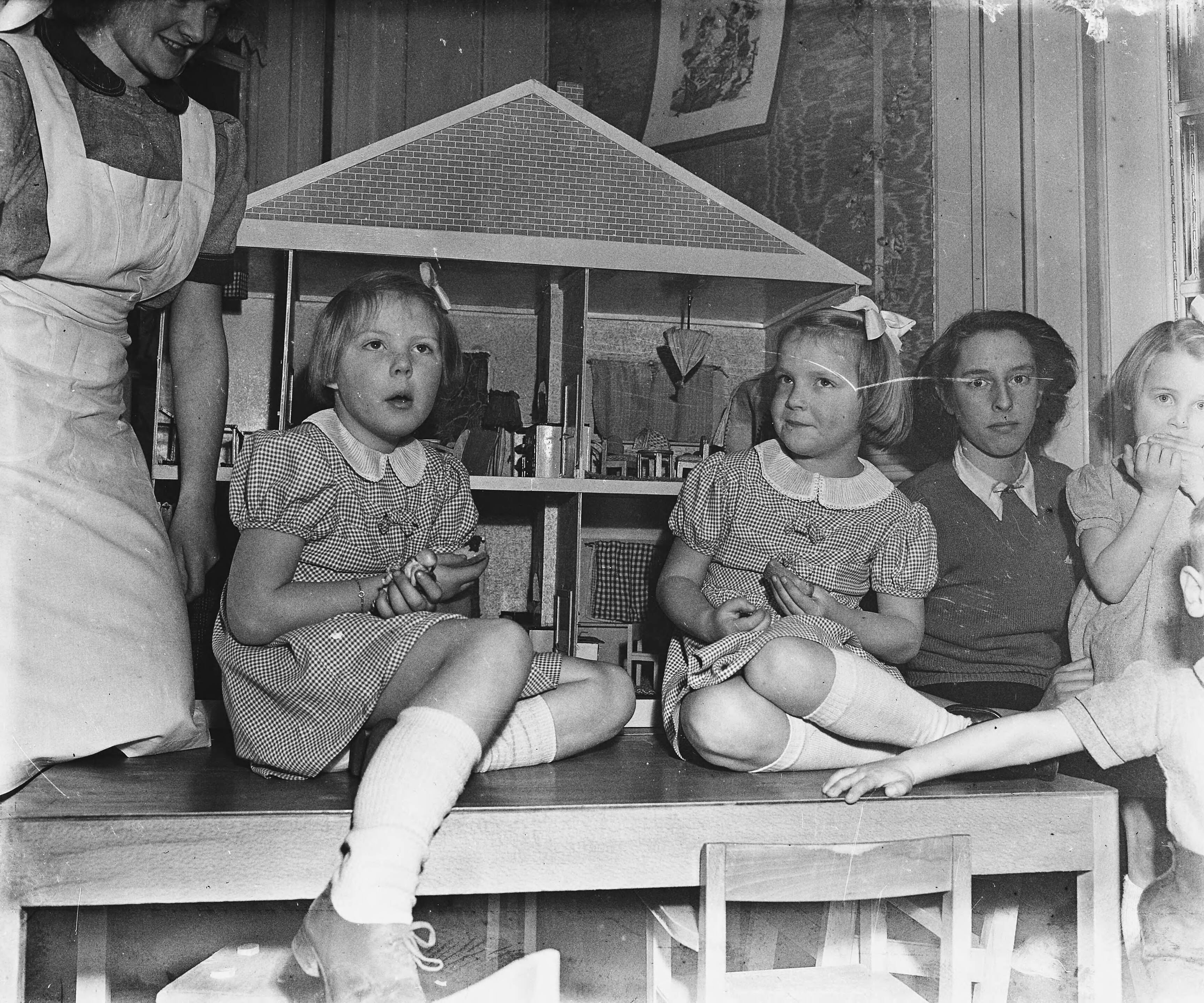 Kinderdagverblijf "Het Kabouterhuis" op de Amsteldijk te Amsterdam. Officiele opening door Prinses Juliana. Prinses Beatrix en prinses Irene bij het door oorlogsinvaliden gemaakte poppenhuis