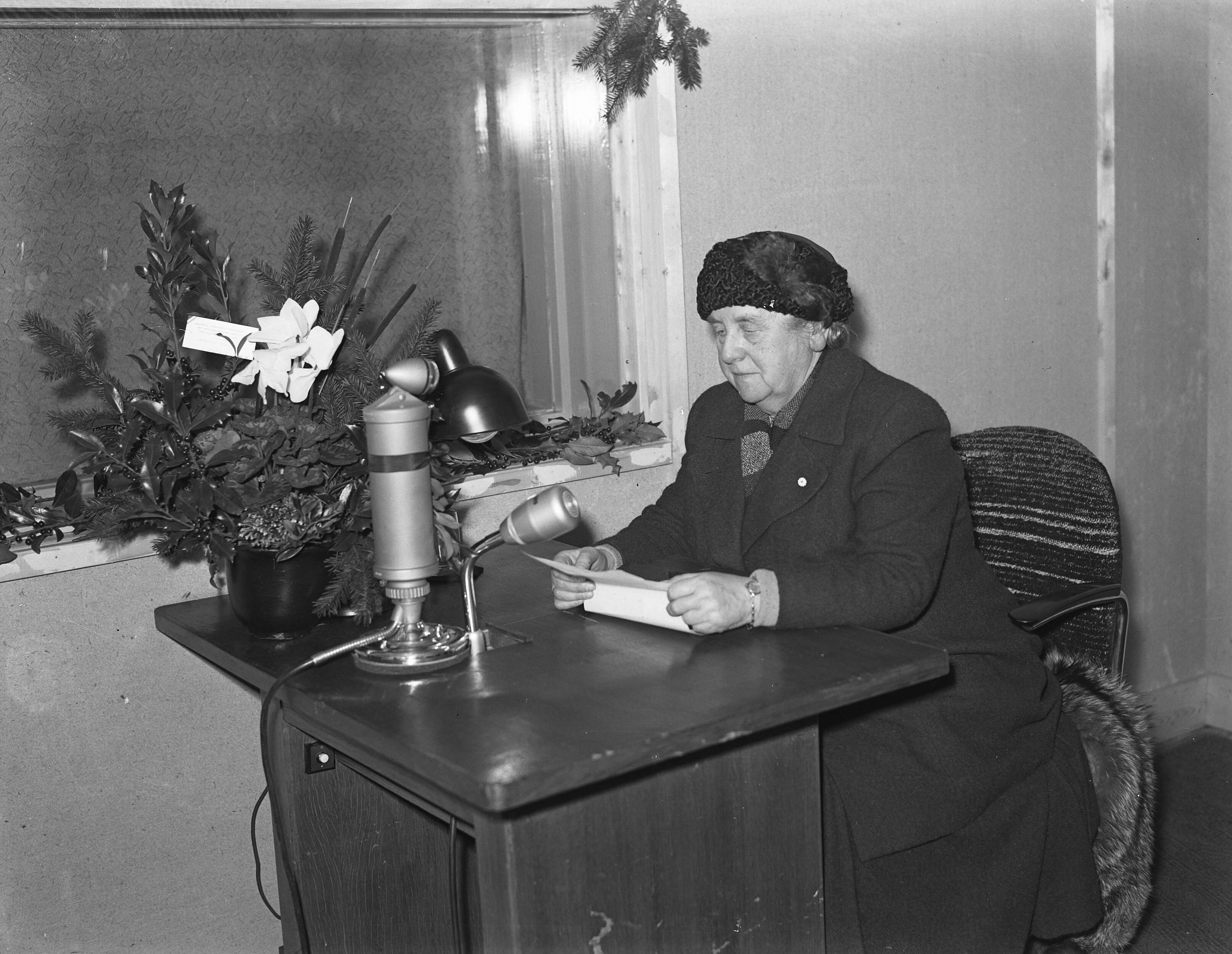Koningin Wilhelmina geeft een radiorede voor de microfoon van herrijzend Nederland.
