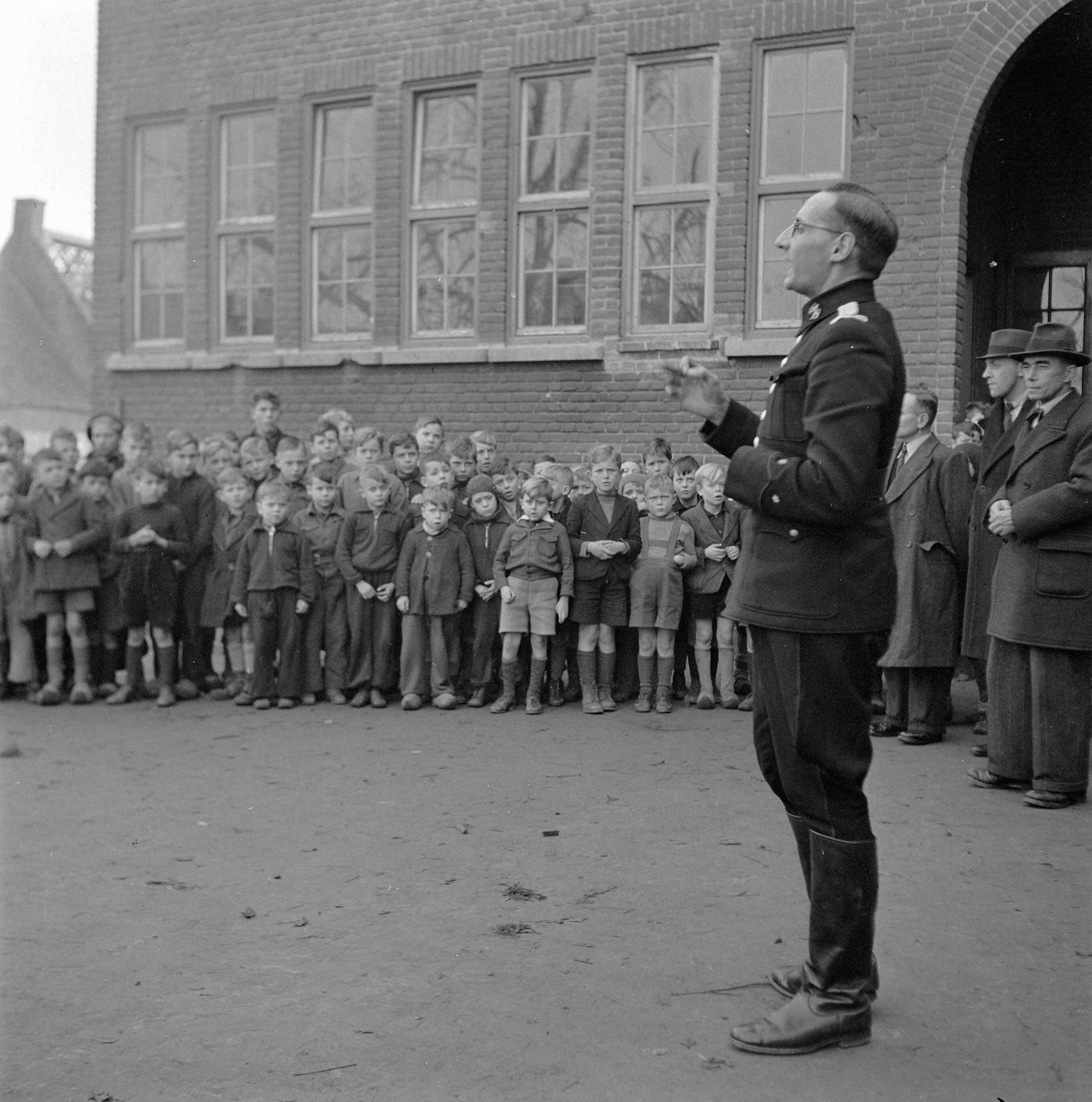 Zuid-Nederland. Reportage over de gevaren van mijnen en achtergelaten munitie voor spelende kinderen. Toespraken van brandweer en politie tot de kinderen. Ensceneringen van ongevallen