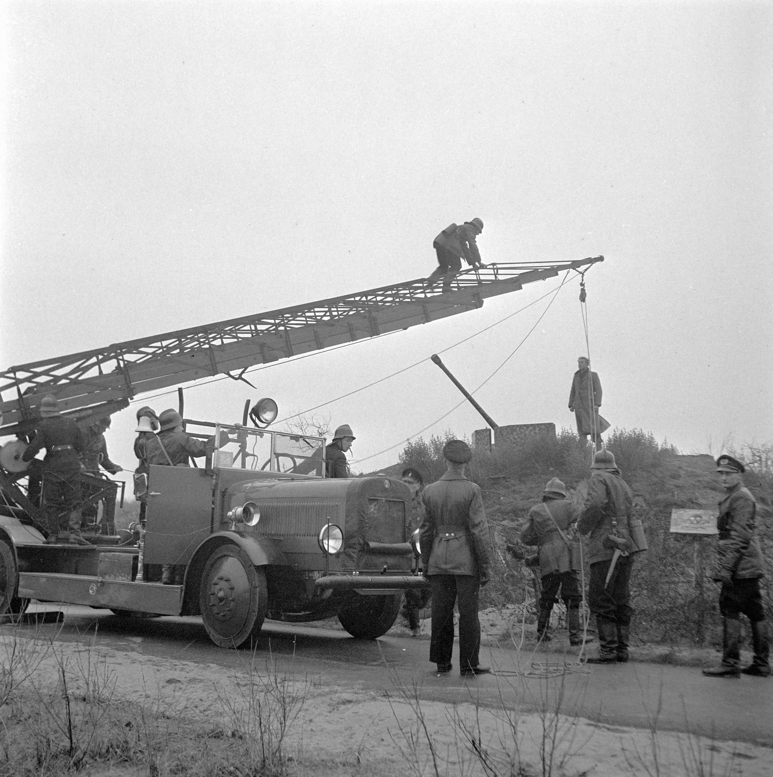 De Haagse politie en brandweer redden een jongen vanaf een voormalige Duitse bunker in een mijnenveld. Hij werd gered met de hulp van de Magirus autoladder van de Haagse brandweer