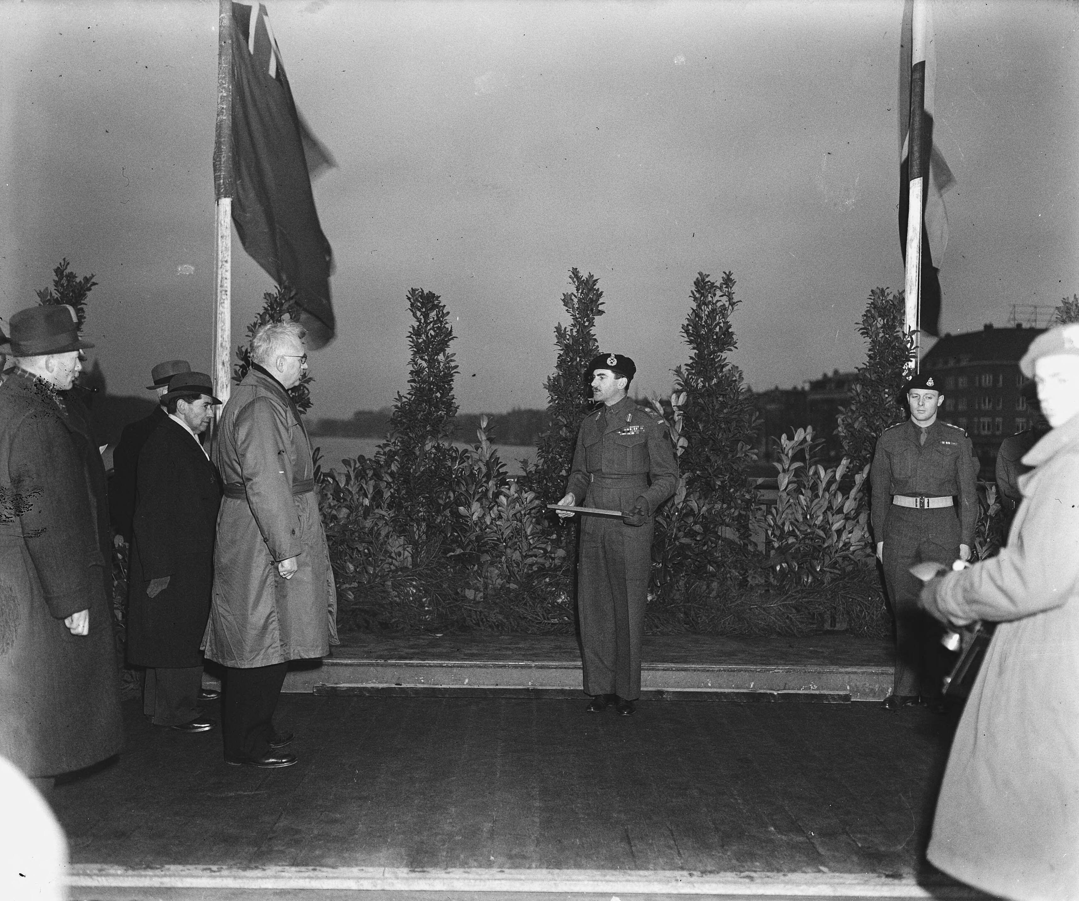 Generaal Simonds en burgemeester De Boer op de Berlagebrug