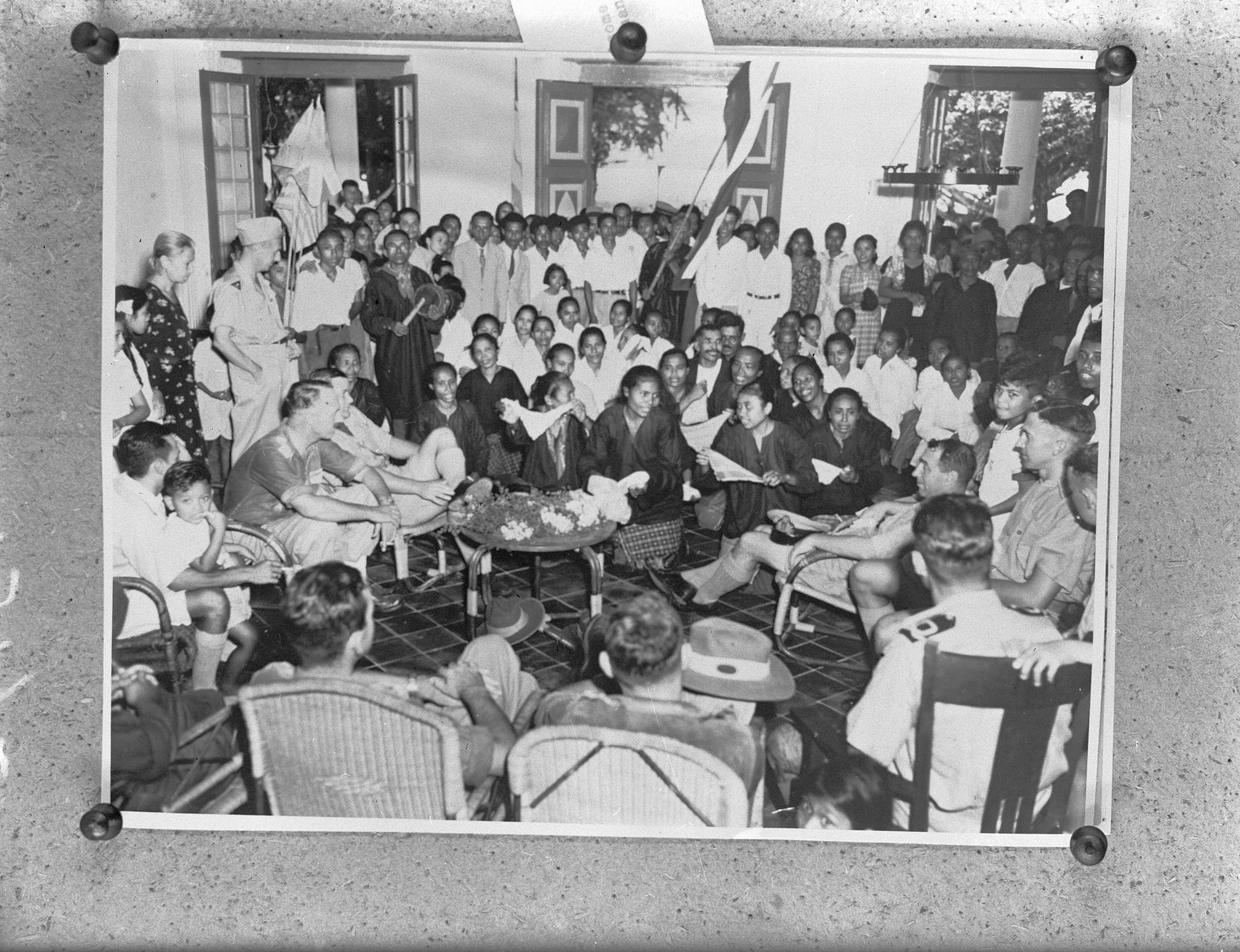Banda. Lokale bevolking voert een dans uit voor een groep NICA ambtenaren en officieren