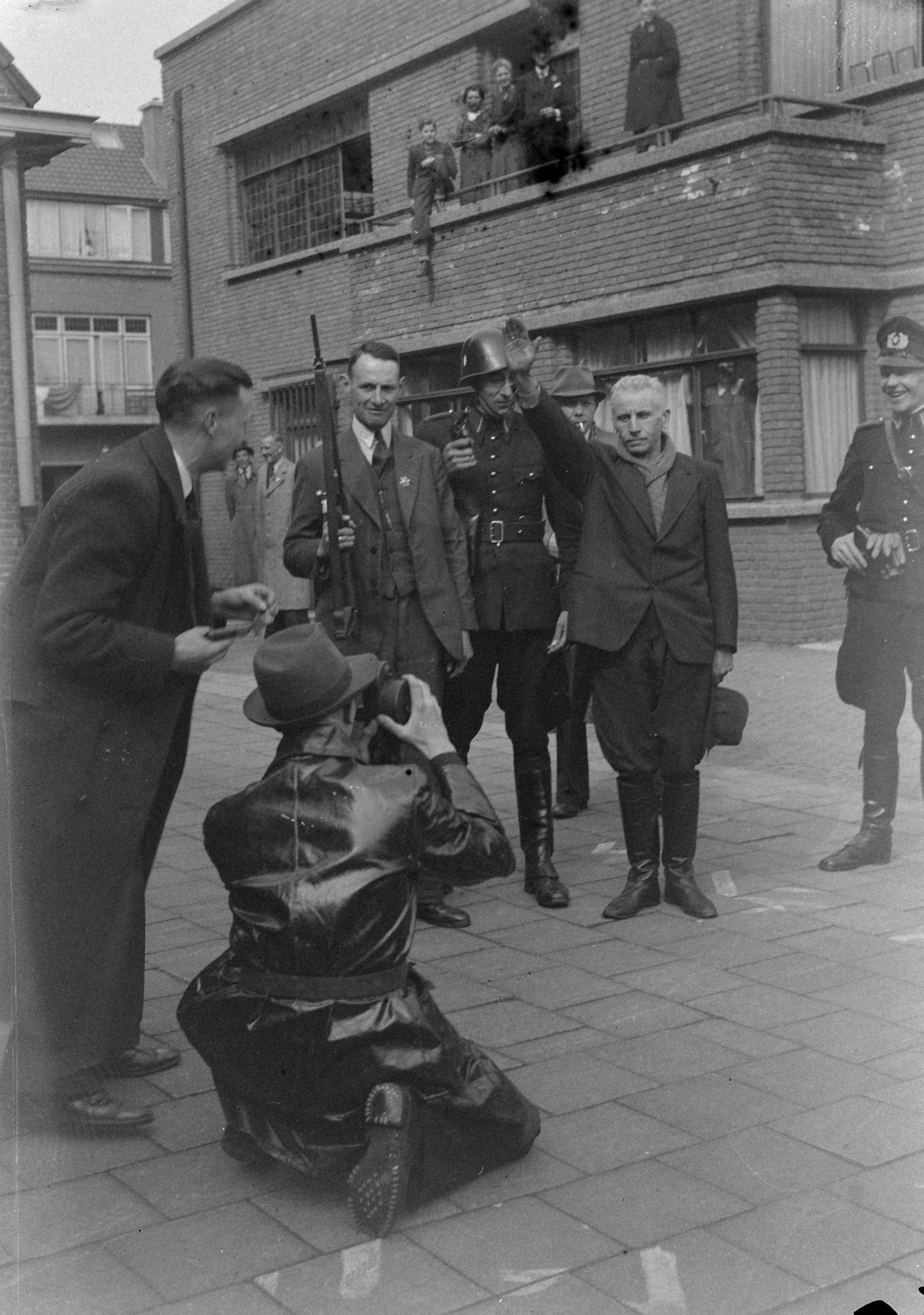 Scenes uit de film "Samen op weg ". De gearresteerde NSB-er en collaborateur en vml. procureur-generaal Robert van Genechten brengt -gedwongen- de Hou Zeegroet en wordt gefotografeerd of gefilmd de opname is van 7 mei 1945, bij na zijn arrestatie. Locatie: het huidige Louis Couperusplein