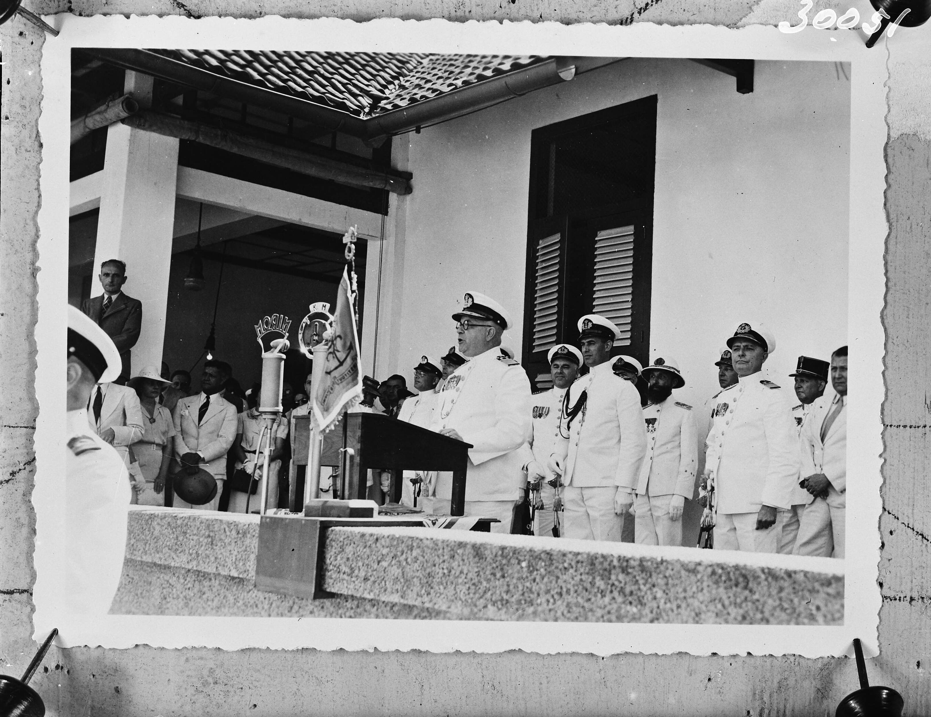Opening van het nieuwe Koninklijk Instituut der Marine (Willemsoord) te Soerabaja door schout-bij-nacht Helfrich. Achter Helfrich, met donkere nestel op zijn linkerborst zijn adjudant luitenant ter zee 2e klasse A.H.W. von Freijtag Drabbe. Direct achter deze (met baard) de gouverneur van Oost Java Ch.O. van der Plas. Links van hem (kijkt in de camera) de eskadercommandant schout-bij-nacht K.W.F.M. Doorman. Links daar weer van de burgemeester van Soerabaja W.A.H. Fuchter. Tussen Doorman en Fuchter (met donkere kepie) generaal-majoor Ilgen, cdt. 3e divisie KNIL te Oost Java. Tussen Helfrich en zijn adjudant, de marinecommandant van Soerabaja kapitein ter zee P. Koenraad.