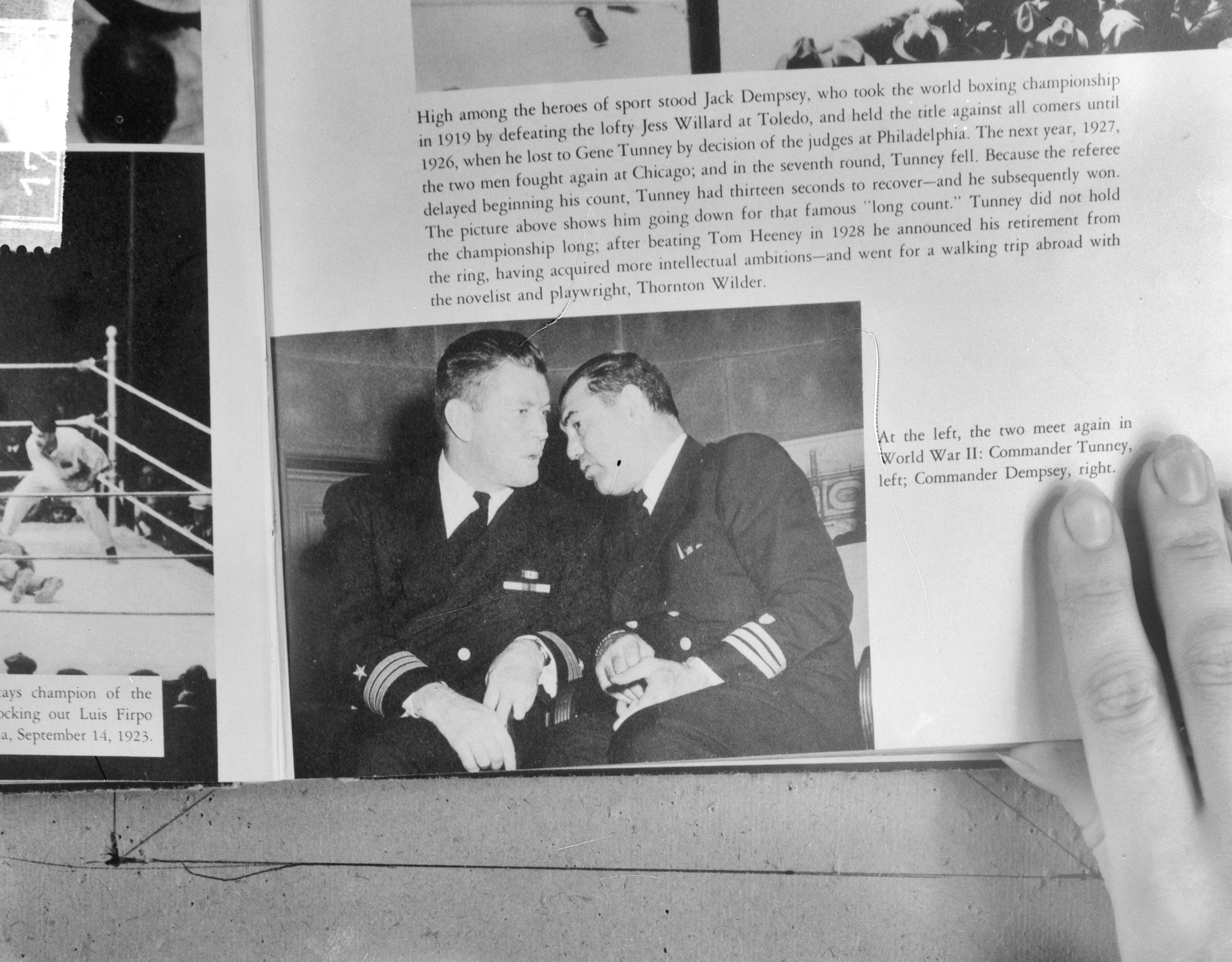 Jack Dempsey (rechts) en Gene Tunney (boksers) als marine-officieren in de Tweede Wereldooorlog