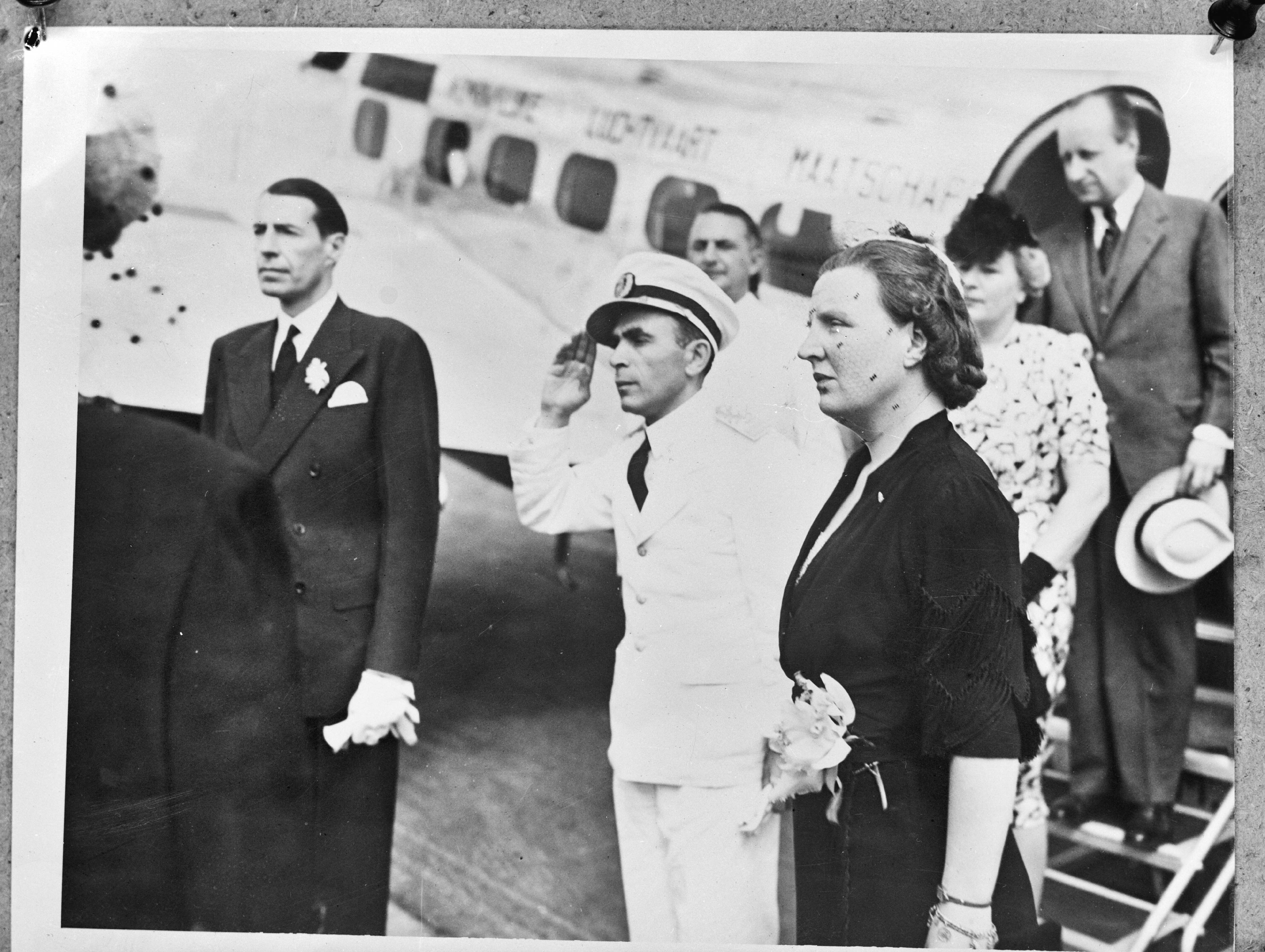 Prinses Juliana tijdens bezoek aan Antillen. Bij aankomst op vliegvled. Naast haar gouverneur P. Kasteel