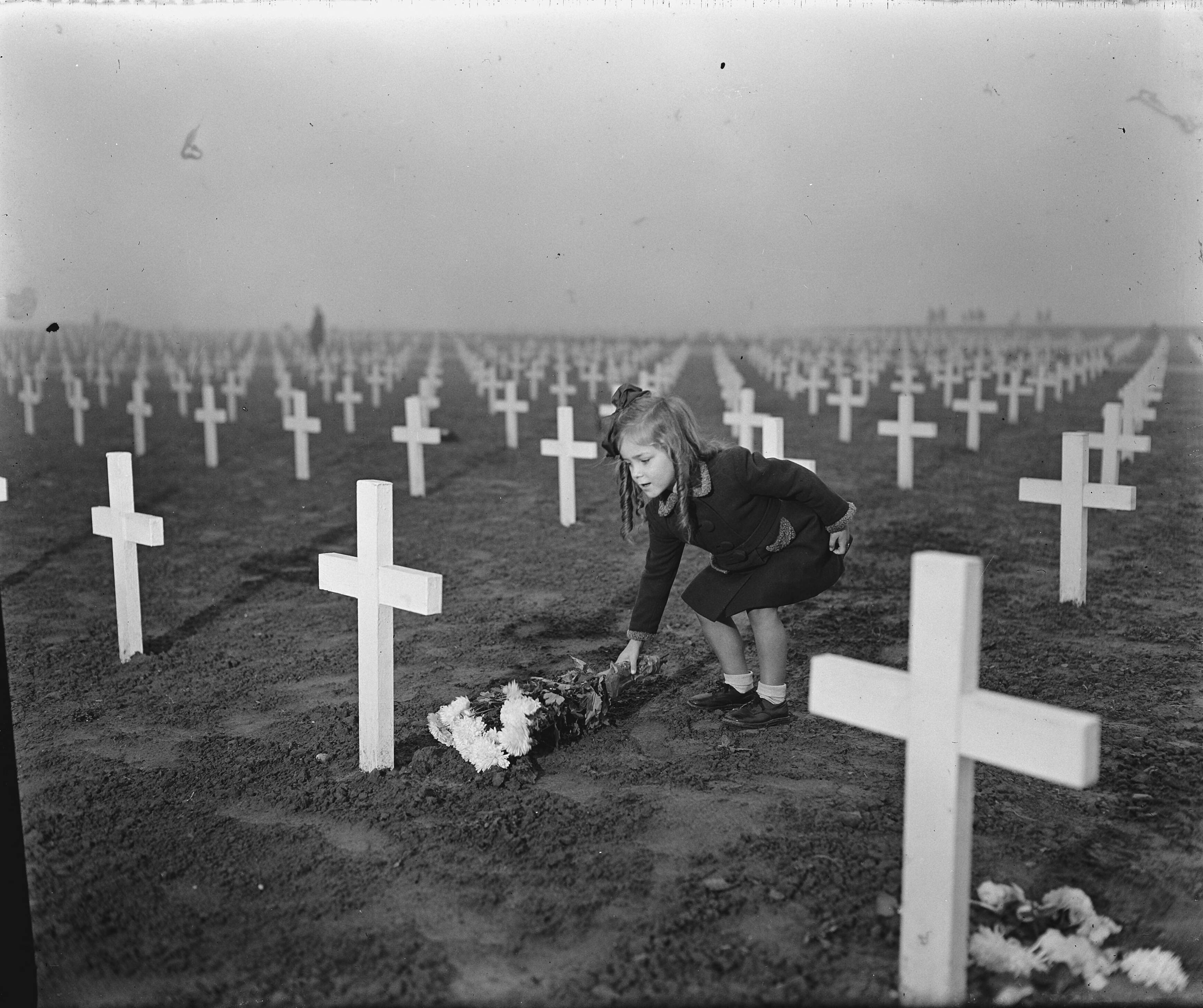 Klein meisje legt bloemen bij een graf
