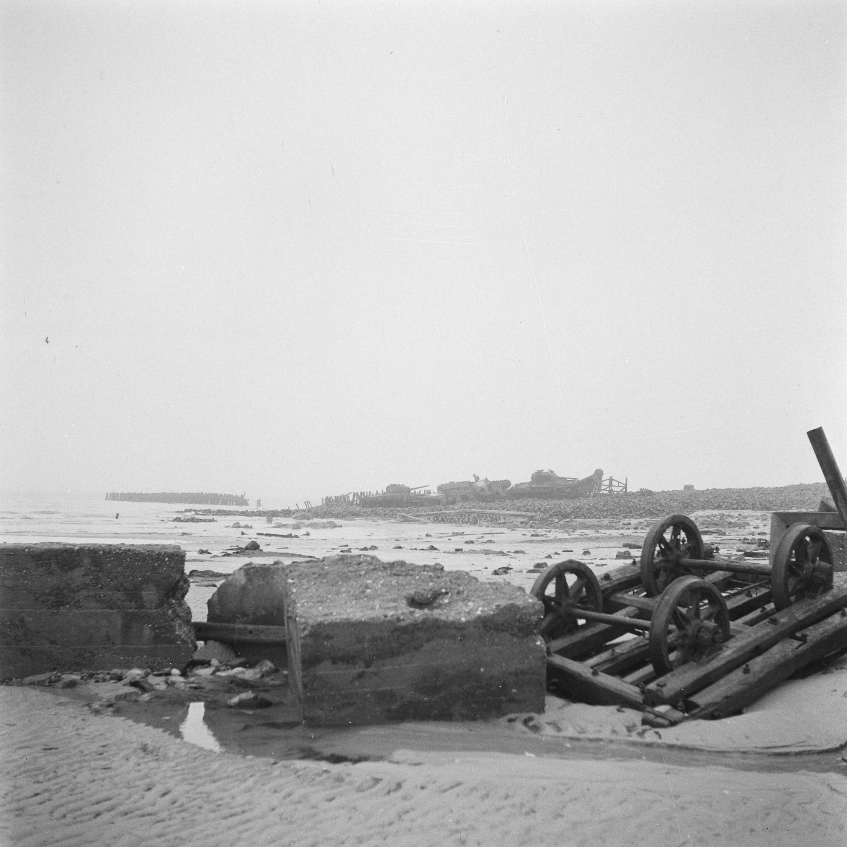 Reportage van het slagveld na de strijd om de Scheldemonding (Westkapelle). Op de achtergrond drie uitgeschakelde tanks, rechts een vlegeltank (mijnenopruimer)