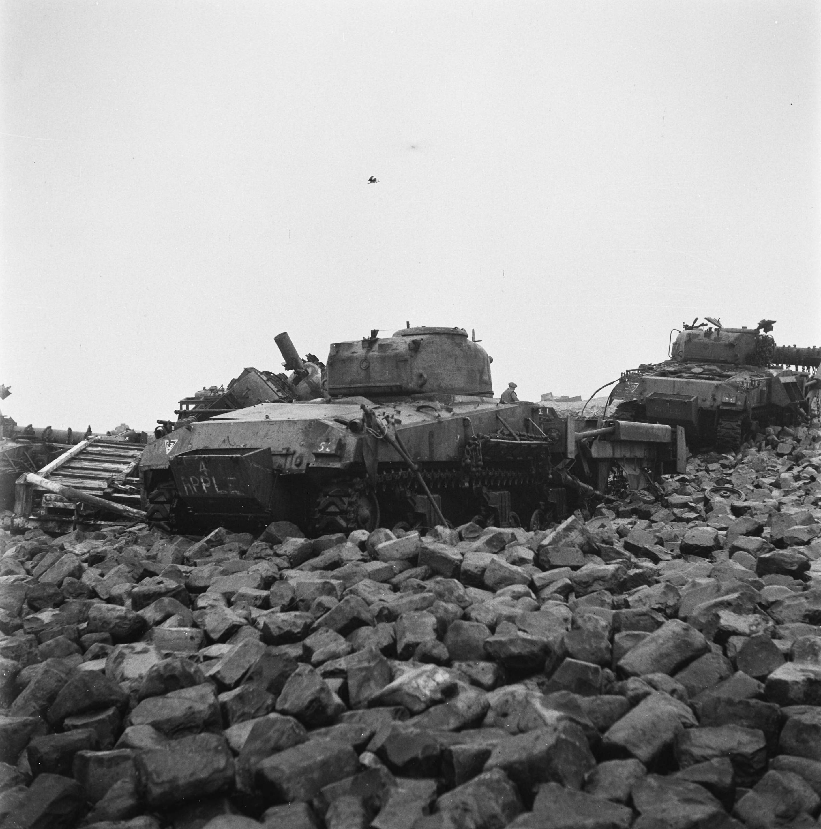 Reportage van het oorlogsgebied na de slag om de Scheldemonding (Westkapelle); uitgeschakelde M4 Shermantanks