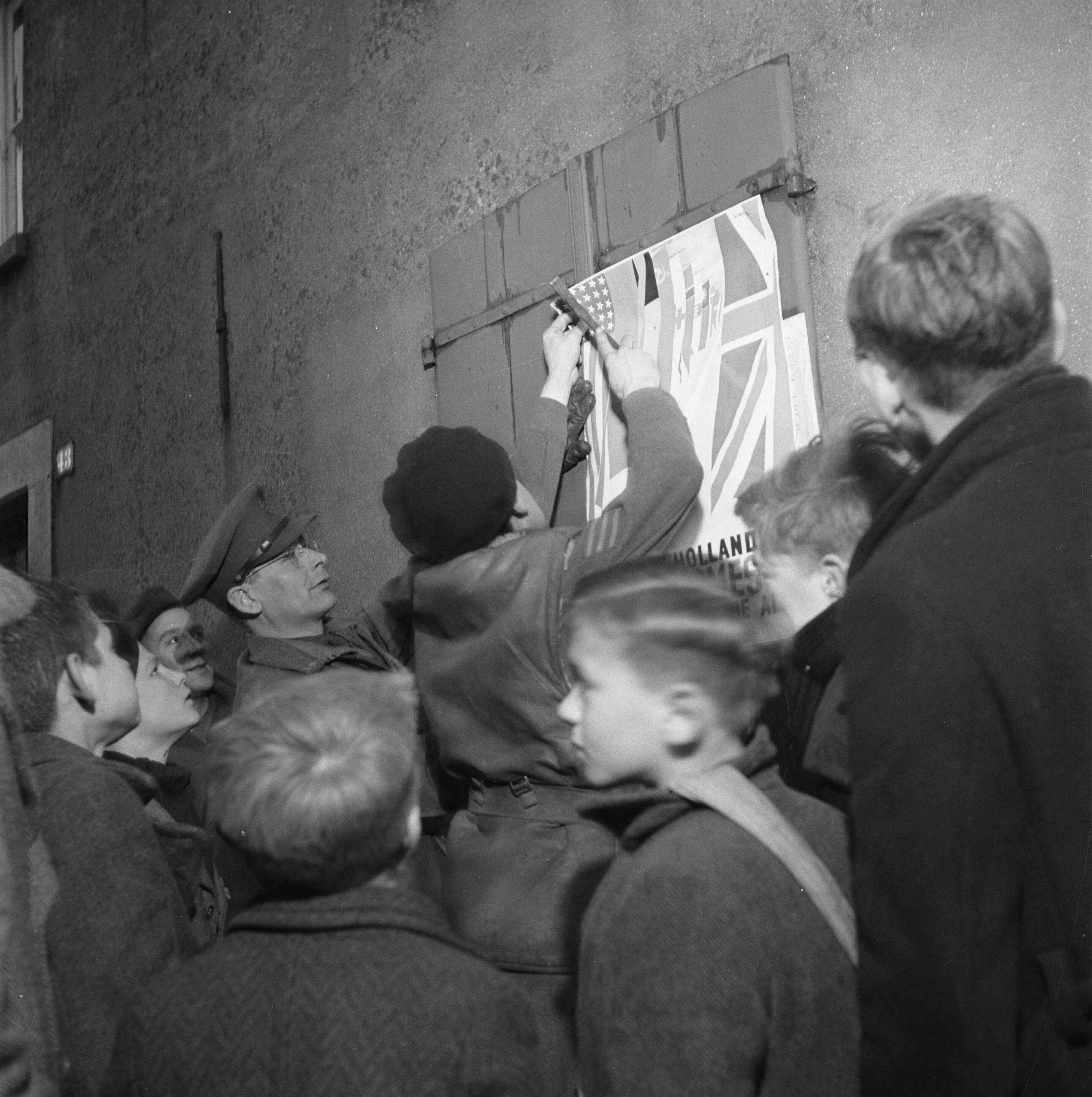 Britse militairen bevestigen een affiche in Venlo.